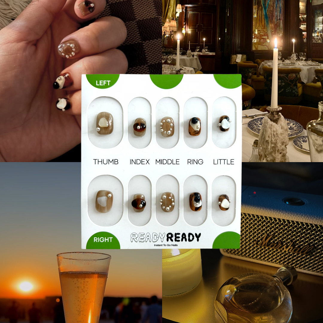 Each READY READY press-on is hand-tested for 30 days to ensure top quality. Amber dazzles with warm, golden hues and sparkling stone accents. Its elegant design adds a touch of glamour to any look. Perfect for turning everyday moments into a luxe statement.