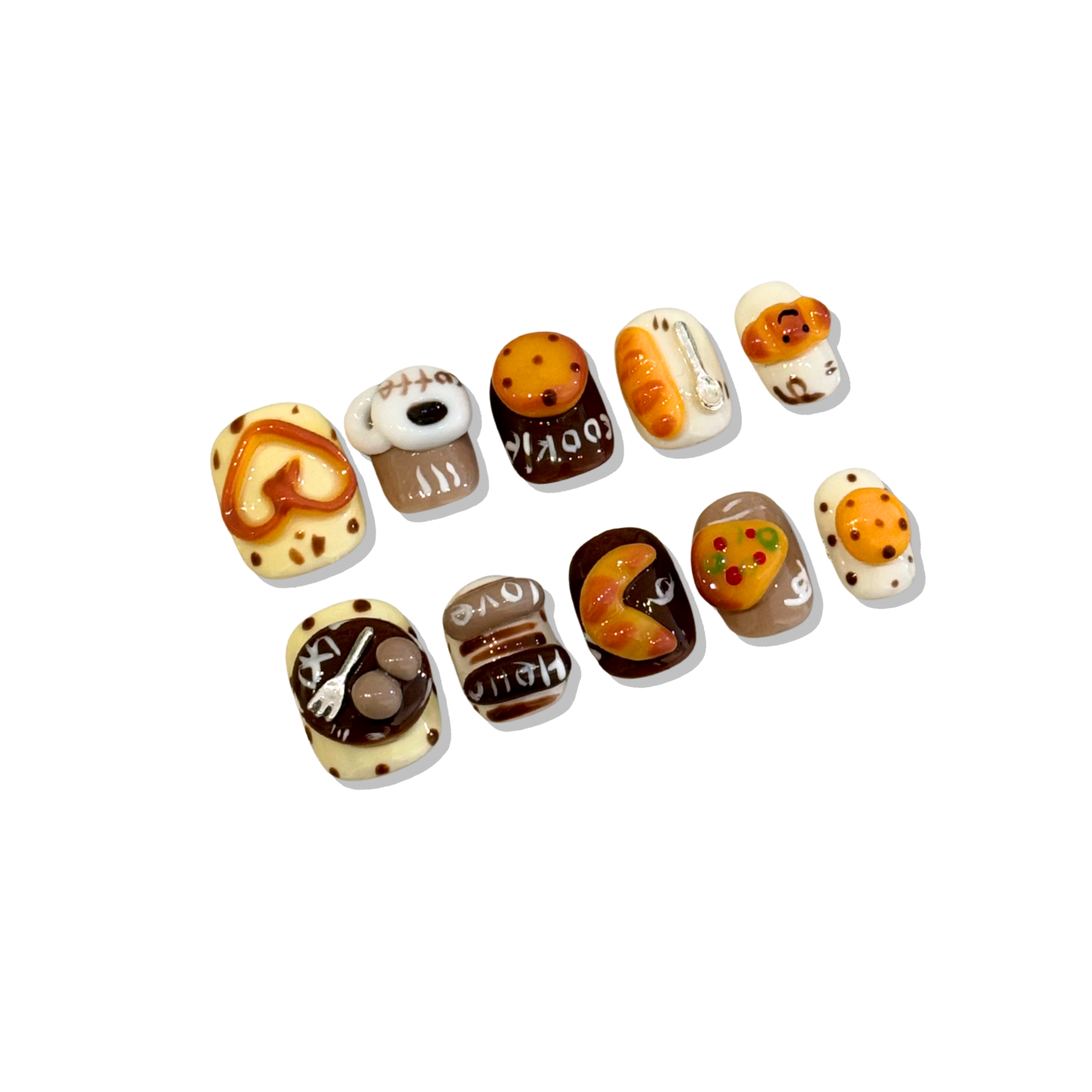 Each READY READY press-on is hand-tested for 30 days to ensure top quality. Bakery Lover features a warm coffee-yellow base with 3D croissants, pretzels, and other bakery treats. Its playful, textured design brings a fun, foodie-inspired touch to your manicure.