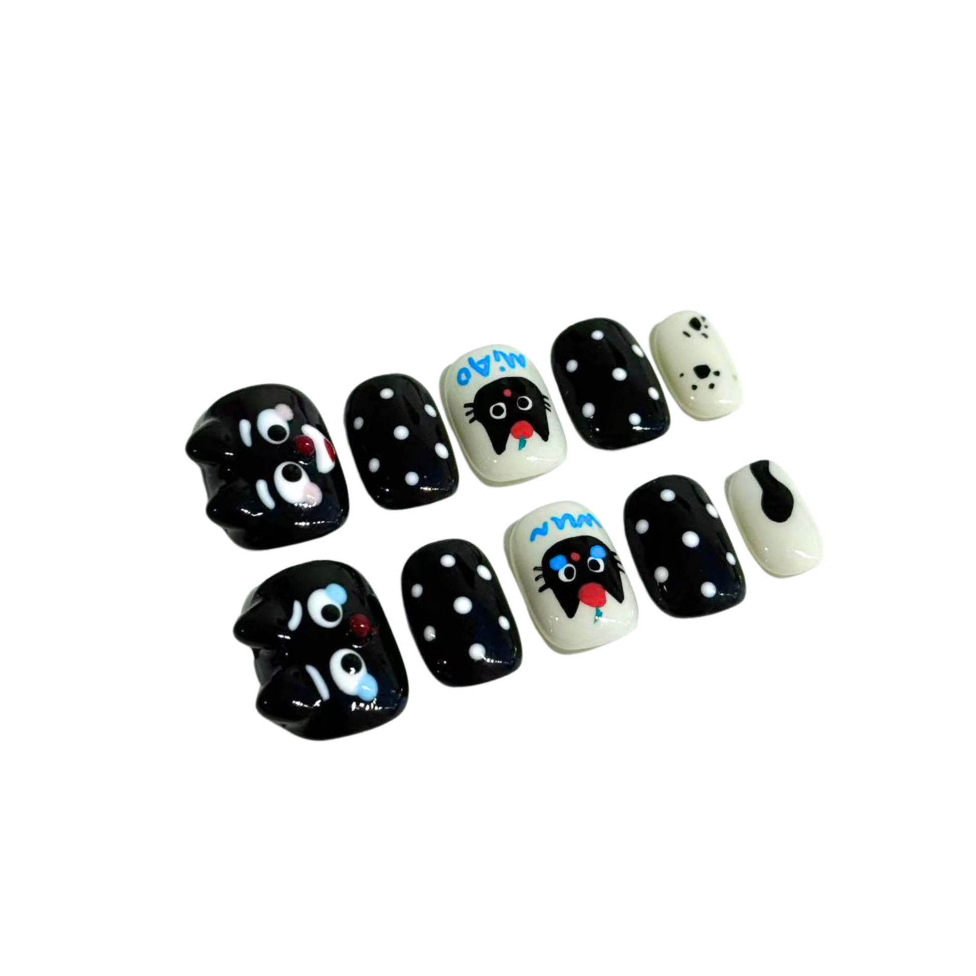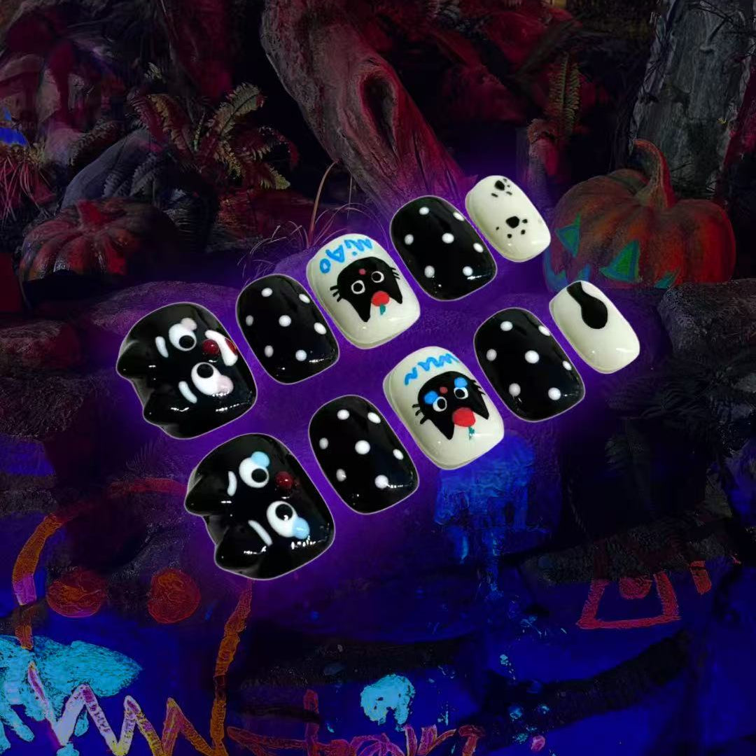 Each READY READY press-on is hand-tested for 30 days to ensure top quality.Black Cat features a black base decorated with playful 3D cat heads and classic polka dots. Its cute yet stylish design adds a fun, whimsical touch to any manicure.