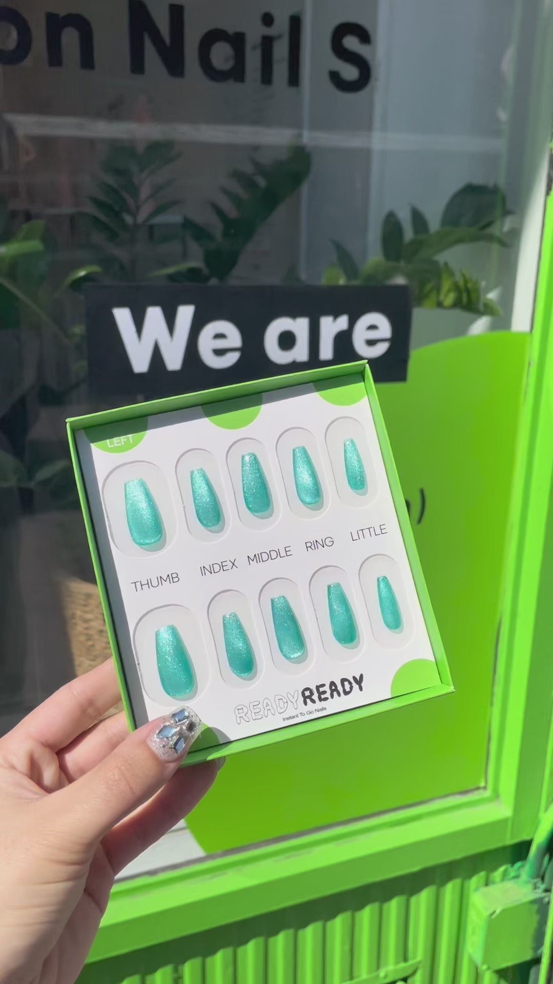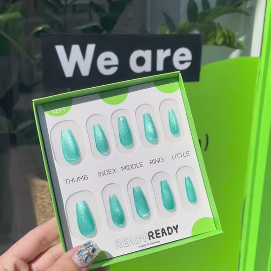 READY READY press-ons are your shortcut to flawless nails in seconds.This Cat Eye set features a mesmerizing light blue shade that shifts with the light. Its sleek, magnetic design creates a subtle, elegant effect. Perfect for a chic, standout manicure in seconds.