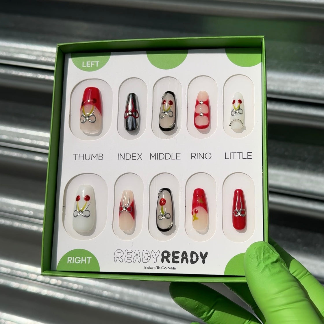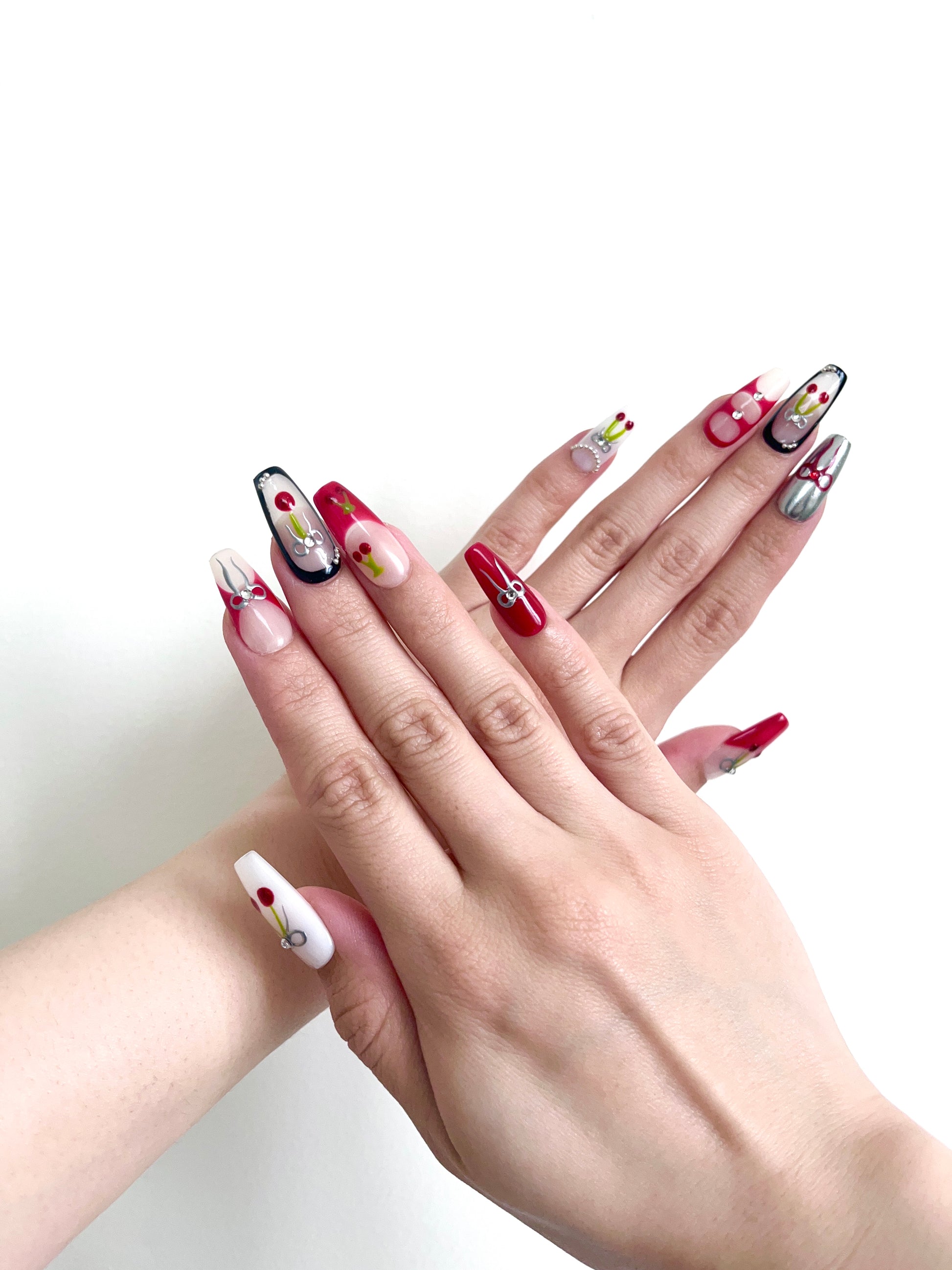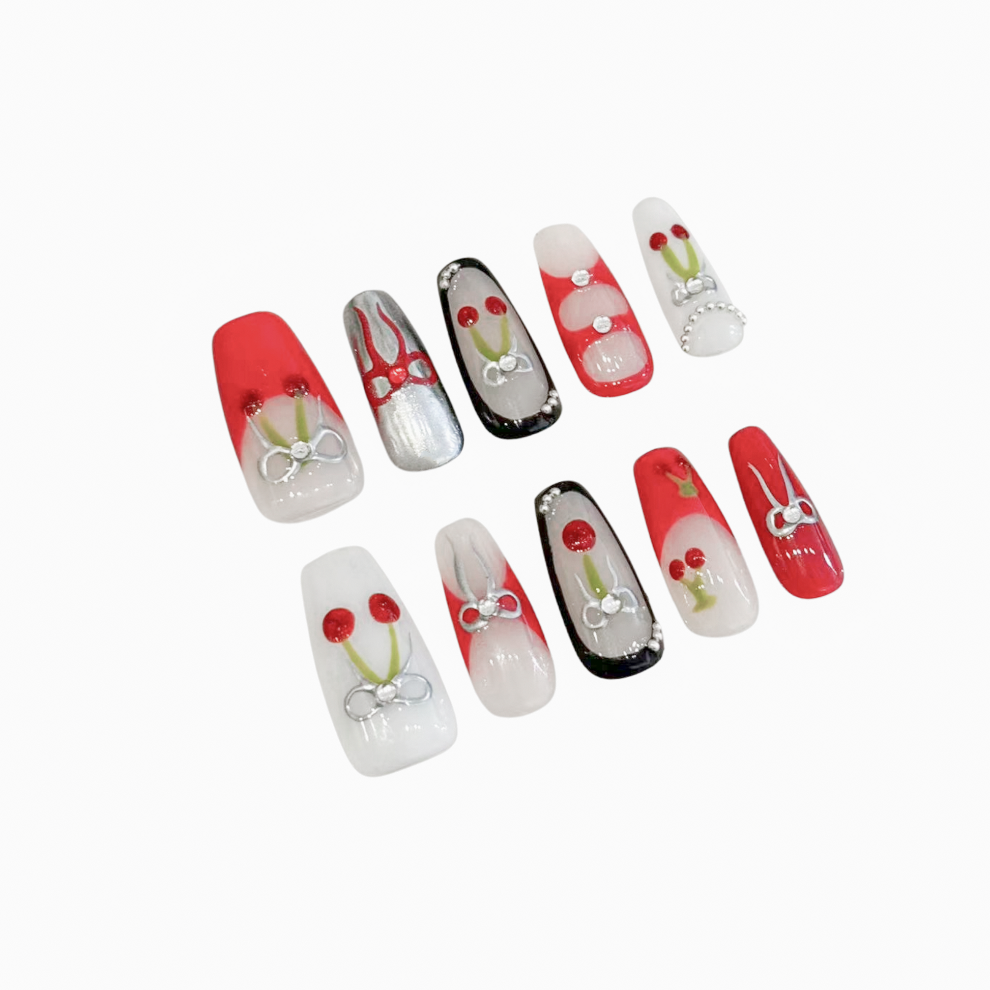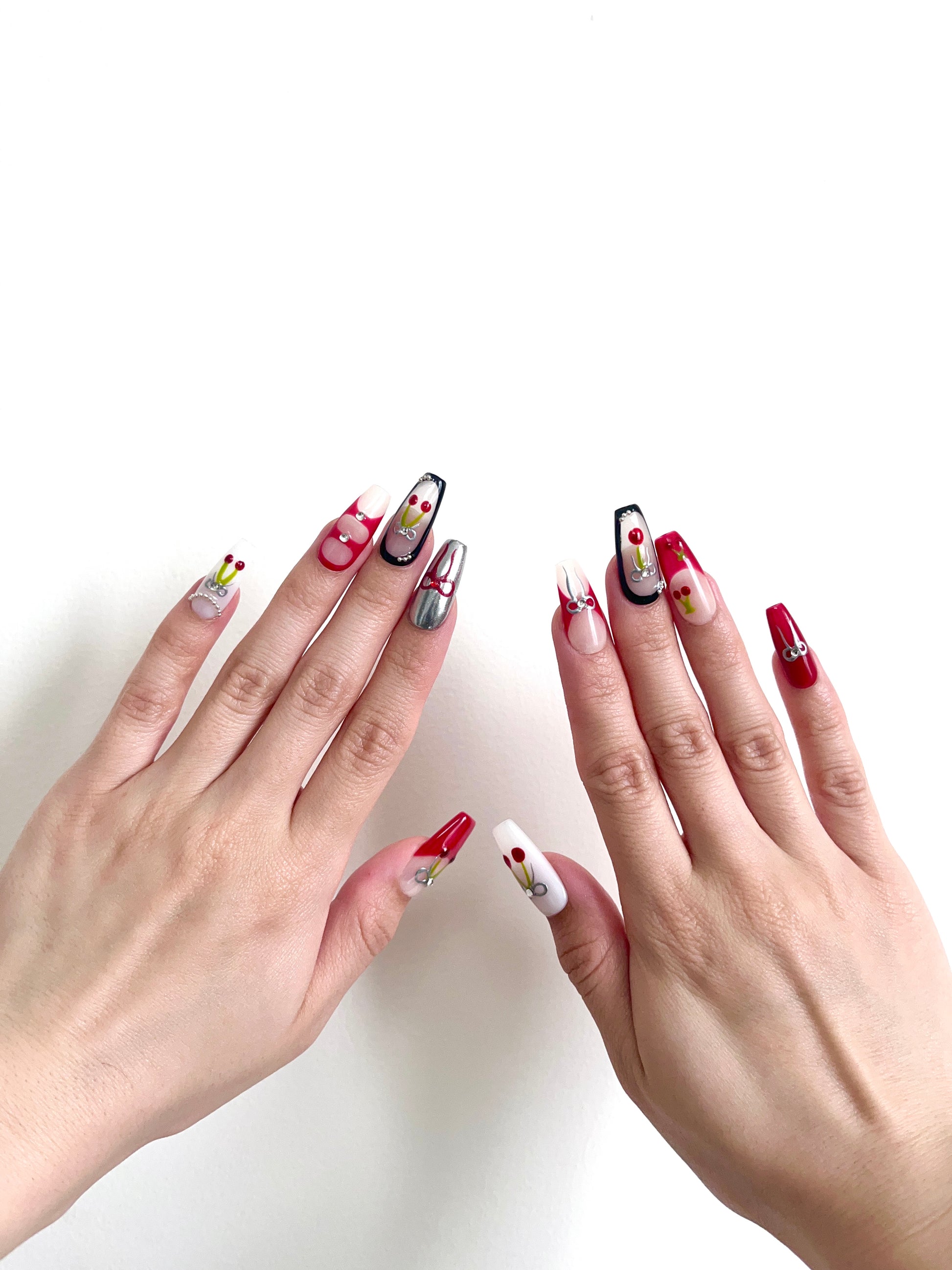 Each READY READY press-on is hand-tested for 30 days to ensure top quality. Cyber Cherry features a milky white base adorned with red, black, and metallic cherry and ribbon accents. Its bold, edgy design adds a playful yet luxurious touch to any manicure.