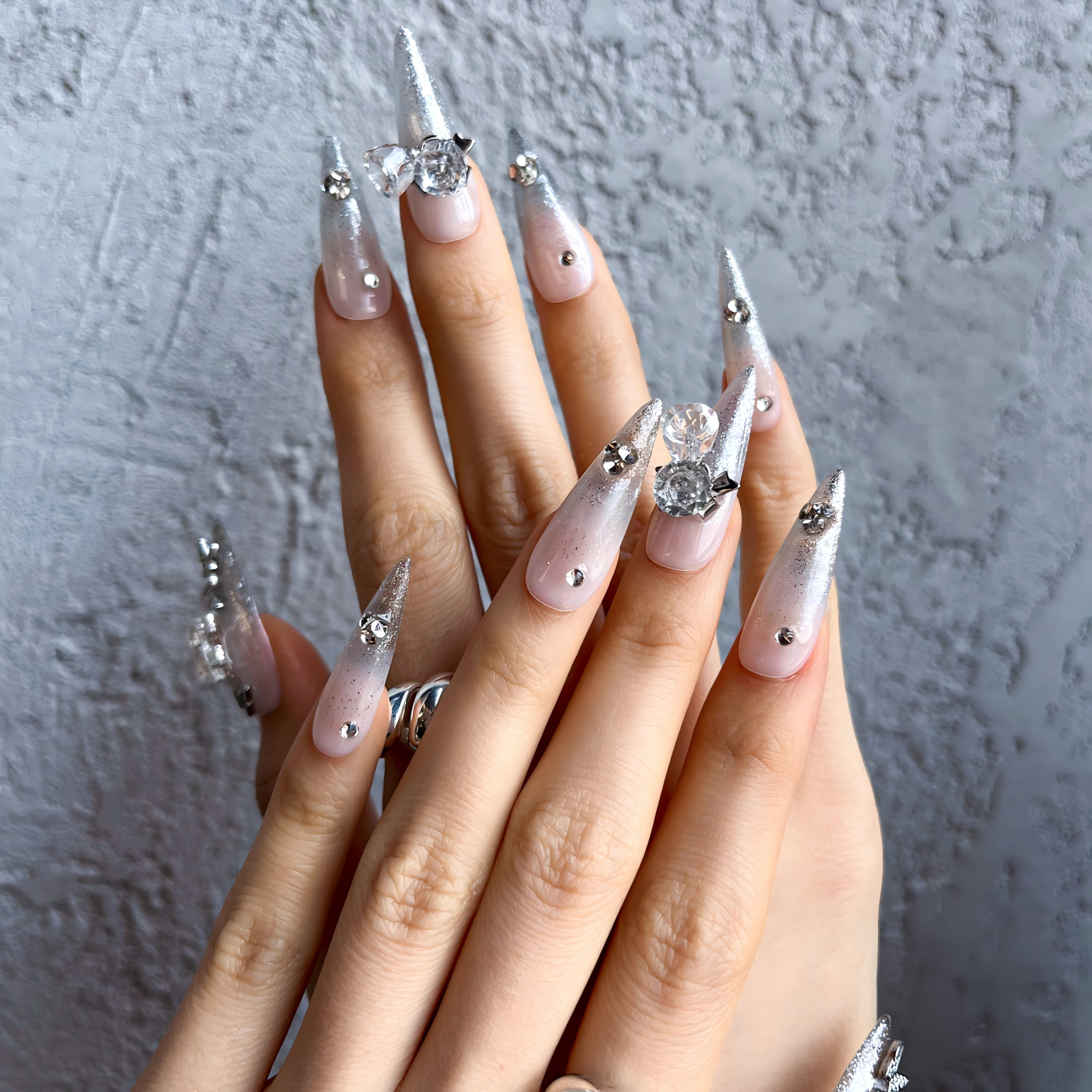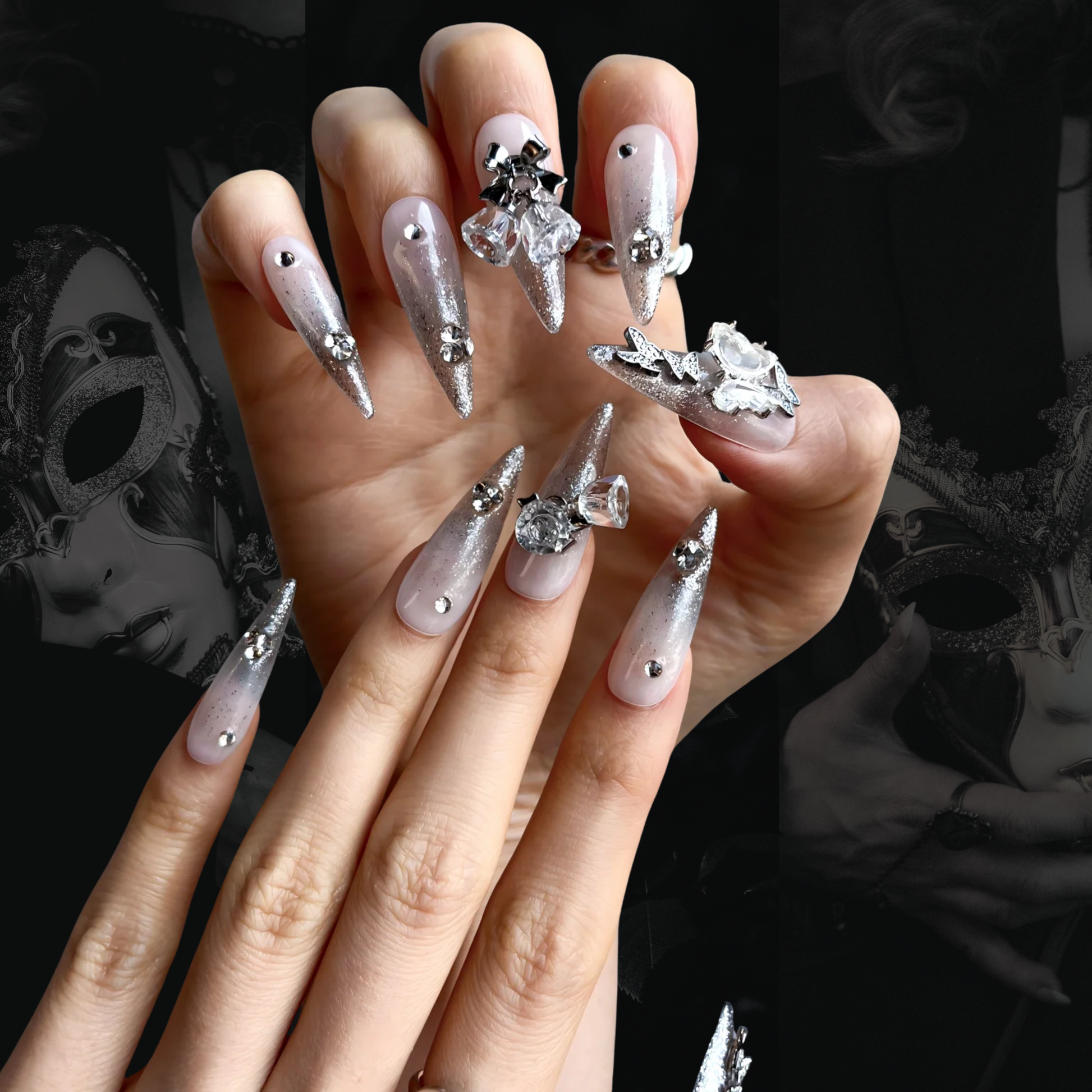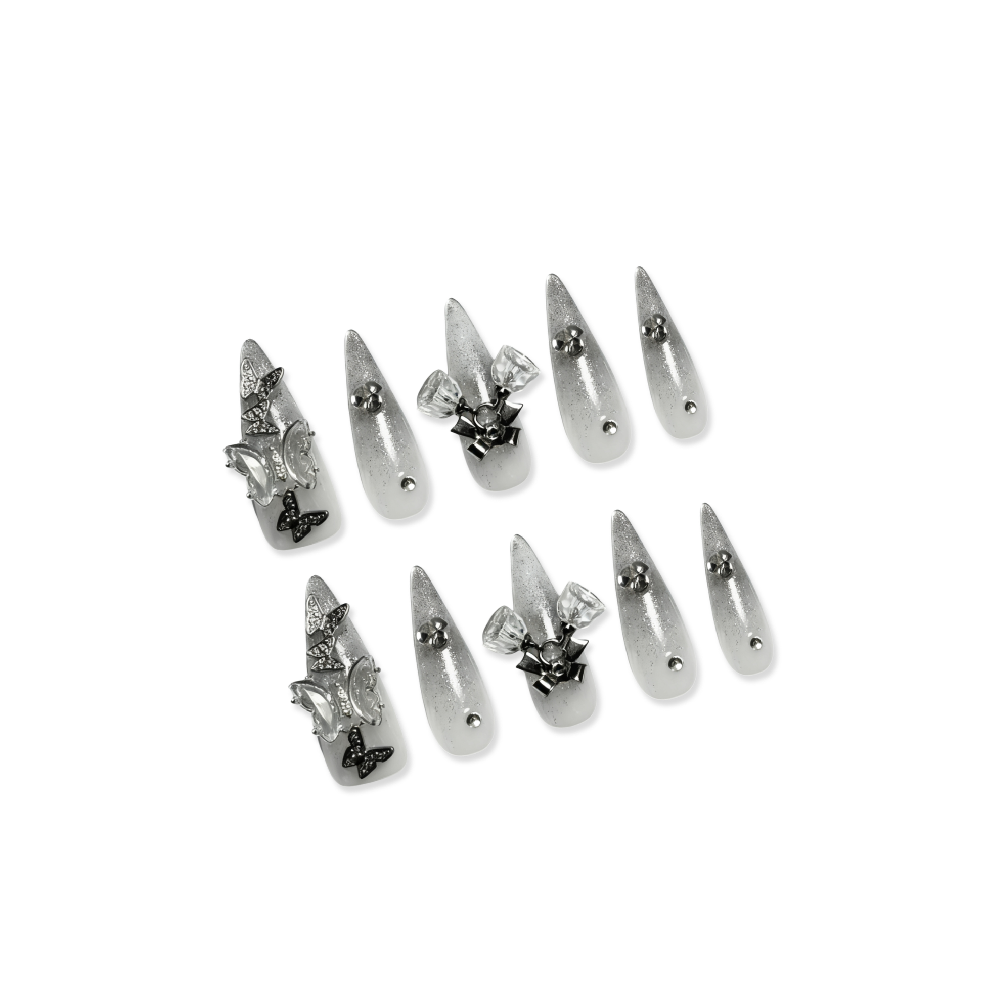 Each READY READY press-on is hand-tested for 30 days to ensure top quality. Christmas Fantasy features a milky base with silver sparkle tips, decorated with crystal bells, ribbons, and butterfly accents. Its festive, whimsical design adds a magical touch to any manicure.
