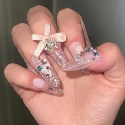 Each READY READY press-on is hand-tested for 30 days to ensure top quality.Pink Camp features a pink-nude base adorned with rhinestones, snowflakes and ribbons. Its elegant, festive design adds a playful and sparkling touch to any manicure. Perfect for a standout, whimsical look in seconds.
