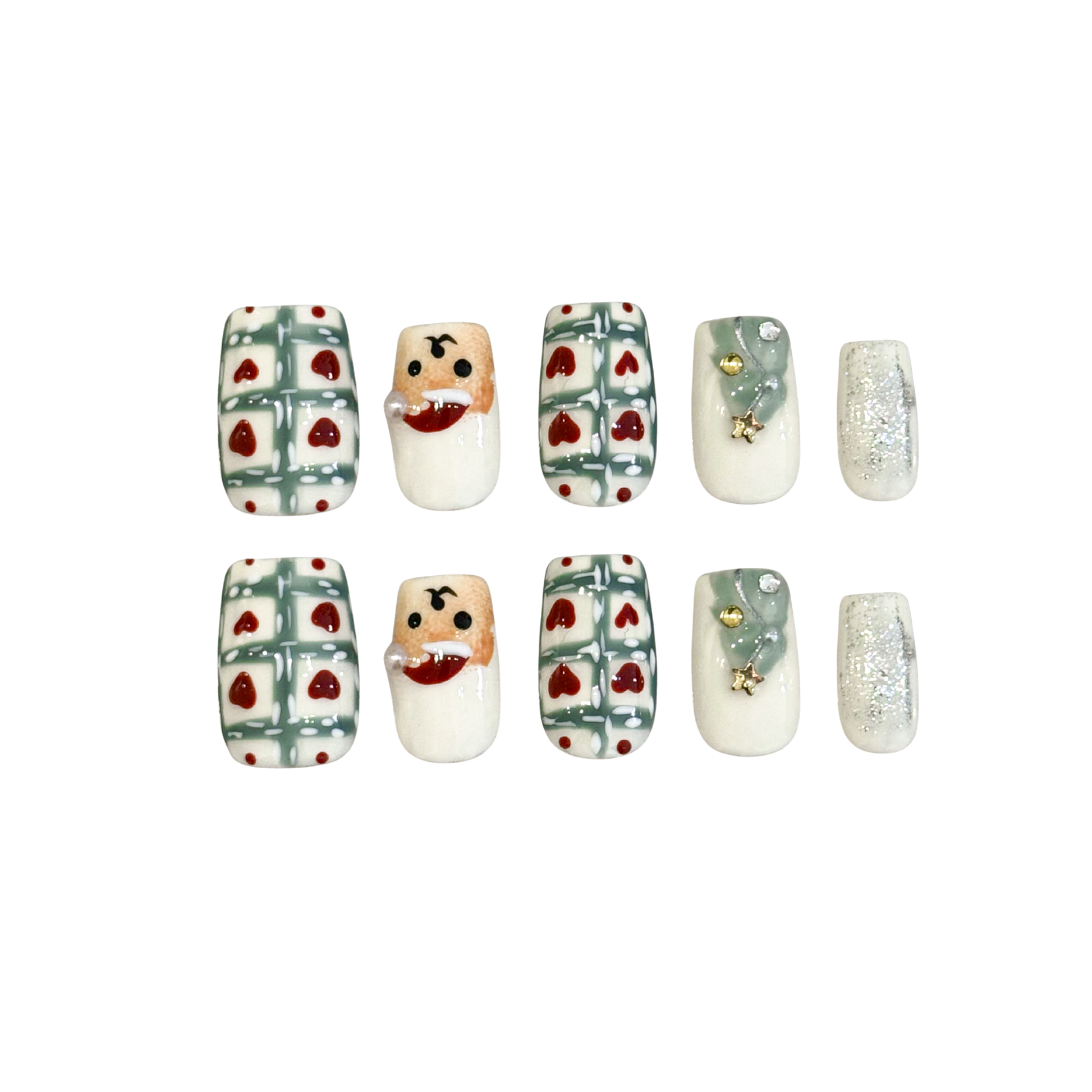 Each READY READY press-on is hand-tested for 30 days to ensure top quality.Christmas Window features a white base with blue striped squares resembling festive windows, one adorned with a bear wearing a Christmas hat. Its playful, seasonal design adds a cheerful and stylish touch to any manicure.