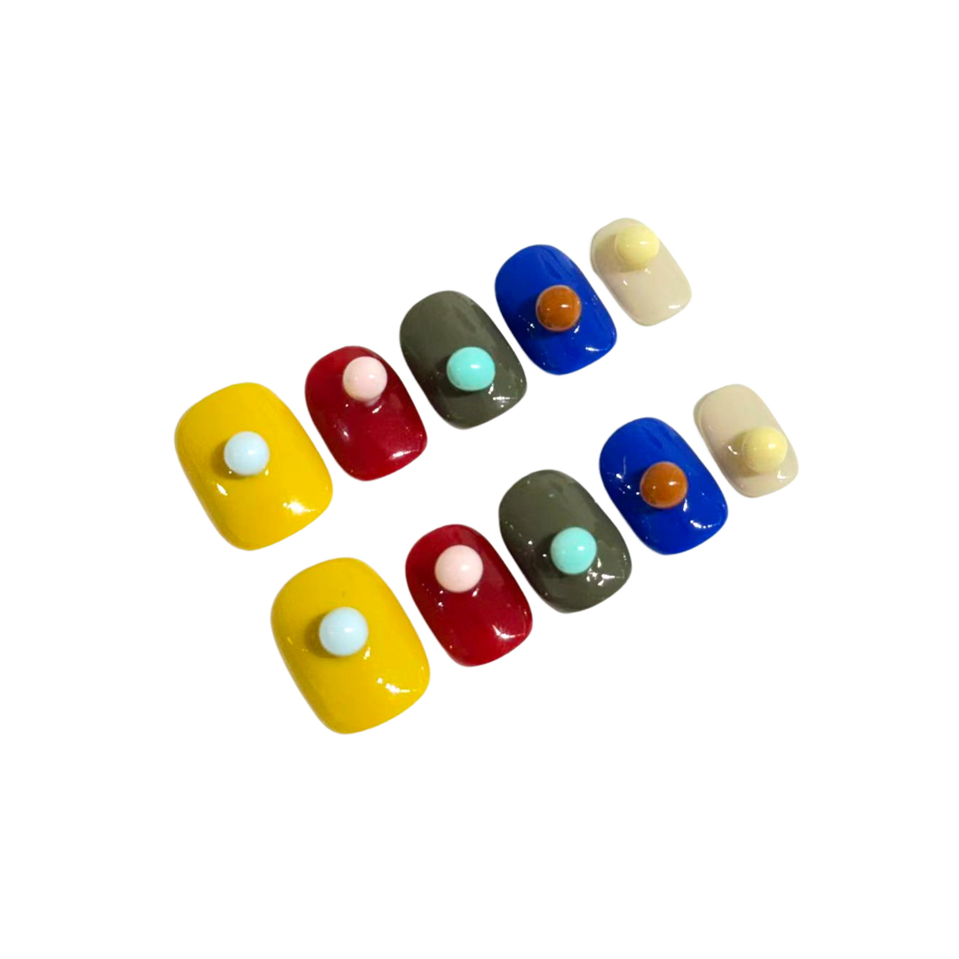 Each READY READY press-on is hand-tested for 30 days to ensure top quality. Colorful Dots features a bright base adorned with playful 3D dot balls in multiple colors. Its fun, vibrant design adds a cheerful and eye-catching touch to any manicure. Perfect for a bold, standout look in seconds.