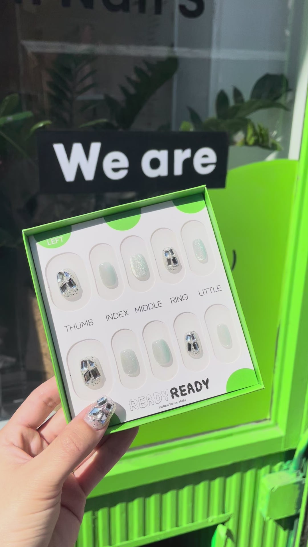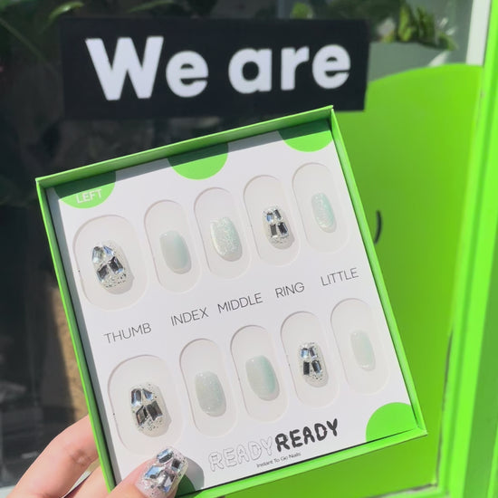 Each READY READY press-on is hand-tested for 30 days to ensure top quality. Crystal Candy features a silver cat-eye base with blue fading accents, adorned with sparkling rhinestones. Its shimmering, playful design adds a bold and elegant touch to any manicure. Perfect for a standout, eye-catching look in seconds.