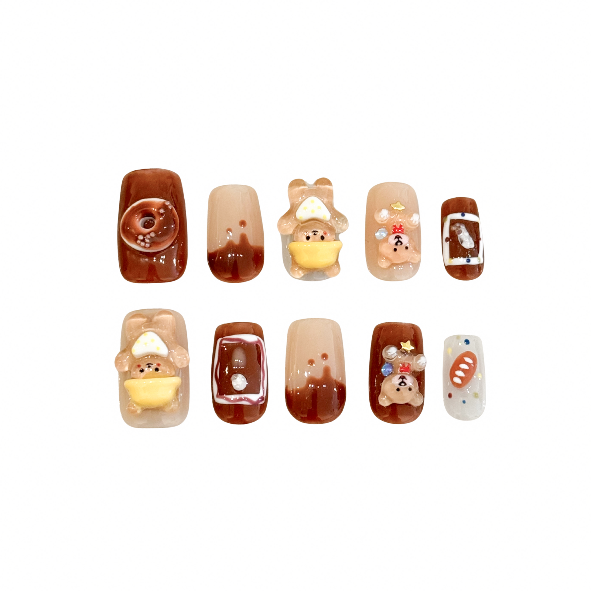 Each READY READY press-on is hand-tested for 30 days to ensure top quality.Cute Bear features a brown-nude base adorned with 3D bears, donuts, and other playful elements. Its whimsical, fun design adds a cheerful and unique touch to any manicure. Perfect for a standout, adorable look in seconds.