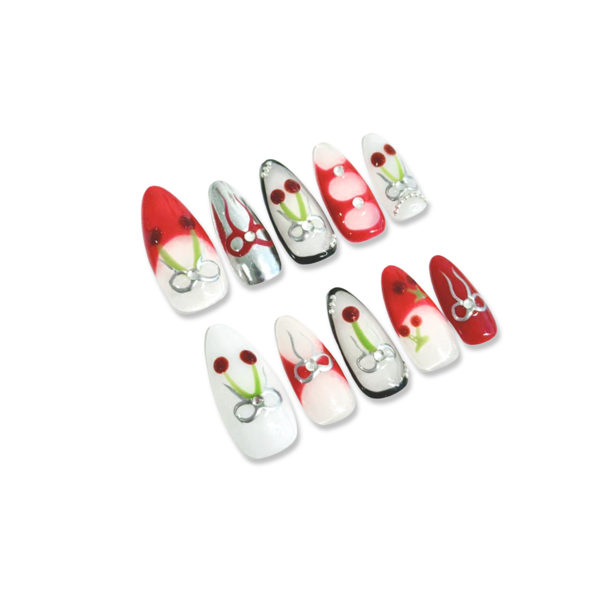 Each READY READY press-on is hand-tested for 30 days to ensure top quality. Cyber Cherry features a milky white base adorned with red, black, and metallic cherry and ribbon accents. Its bold, edgy design adds a playful yet luxurious touch to any manicure.