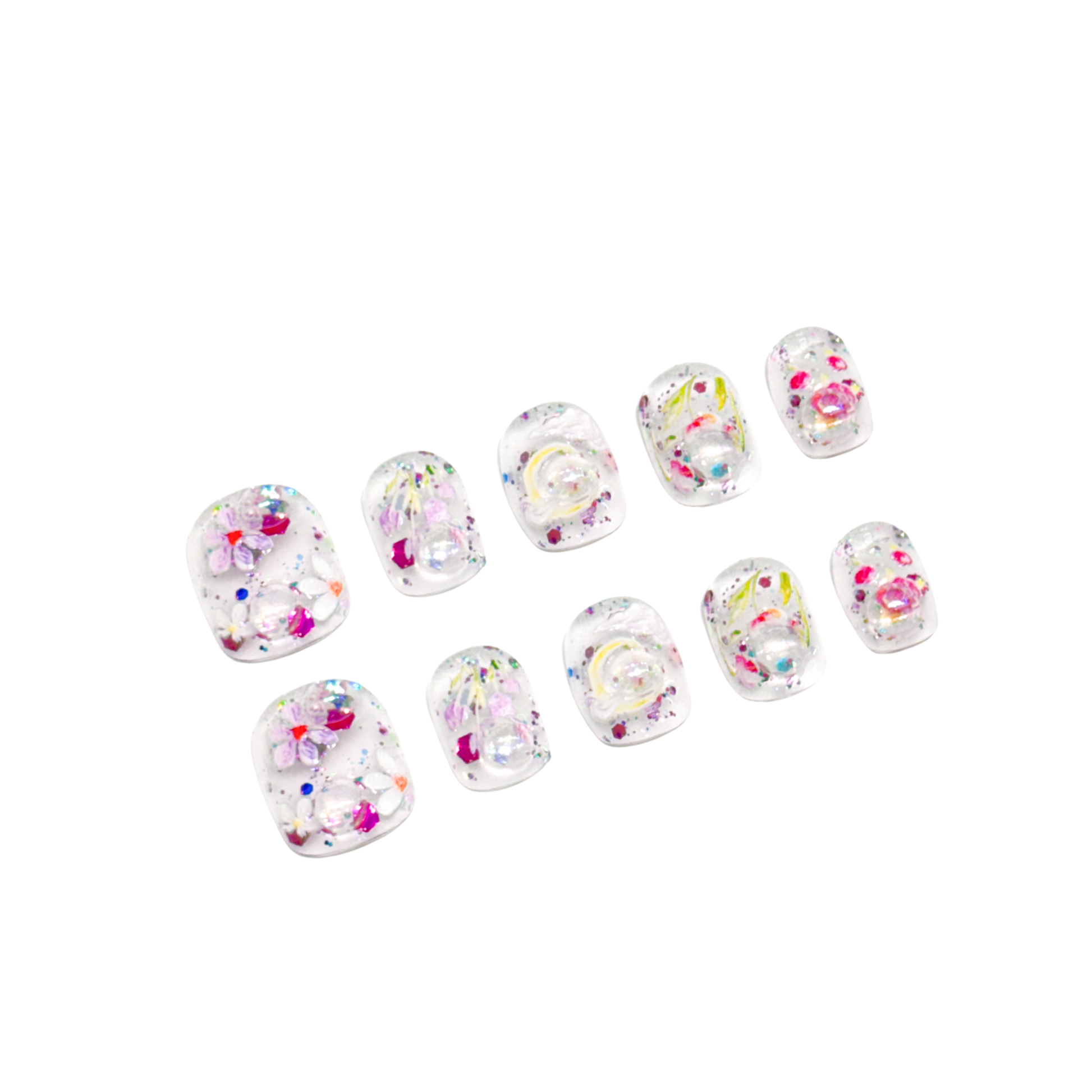 Each READY READY press-on is hand-tested for 30 days to ensure top quality. Daisy features a transparent glitter base adorned with colorful, hand-painted little daisies. Its playful, vibrant design adds a cheerful and artistic touch to any manicure.