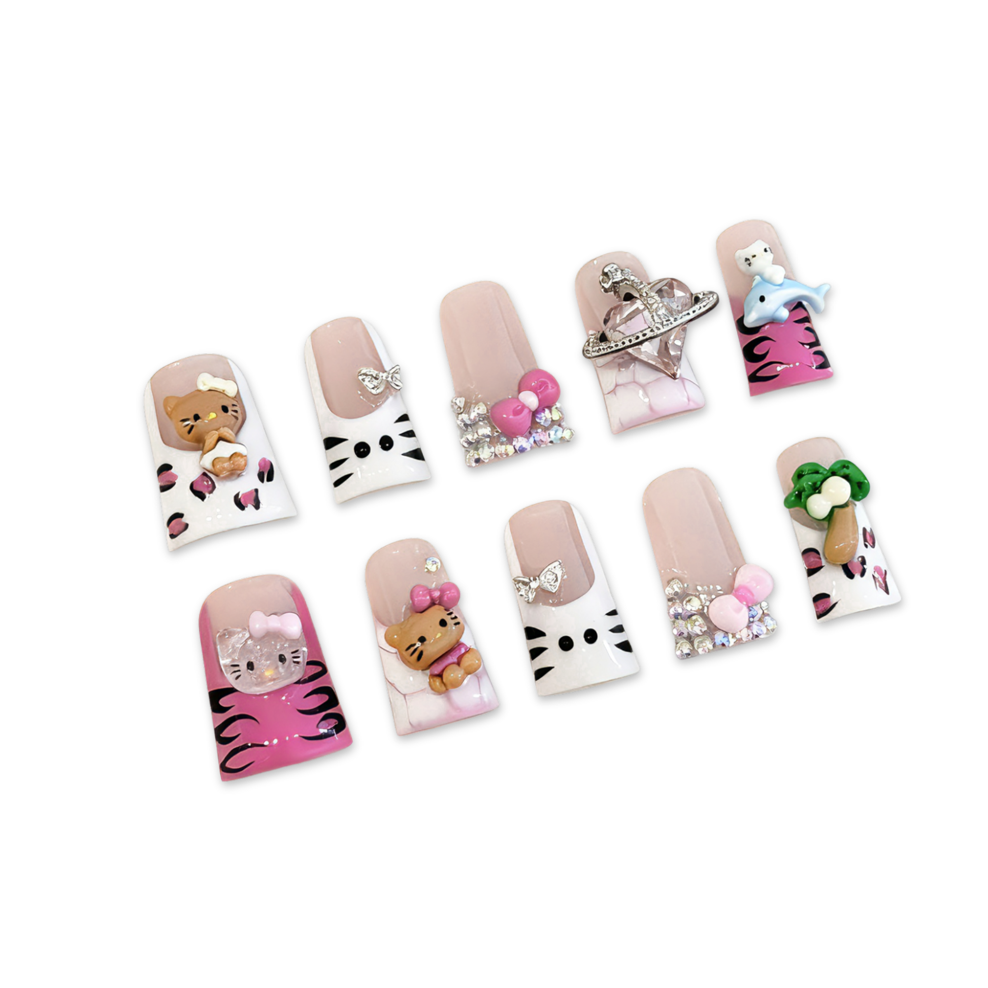 Each READY READY press-on is hand-tested for 30 days to ensure top quality.Duck Kitty features a playful French design in pink and white, adorned with 3D kitty. Its whimsical, cute style adds a fun and charming touch to any manicure.
