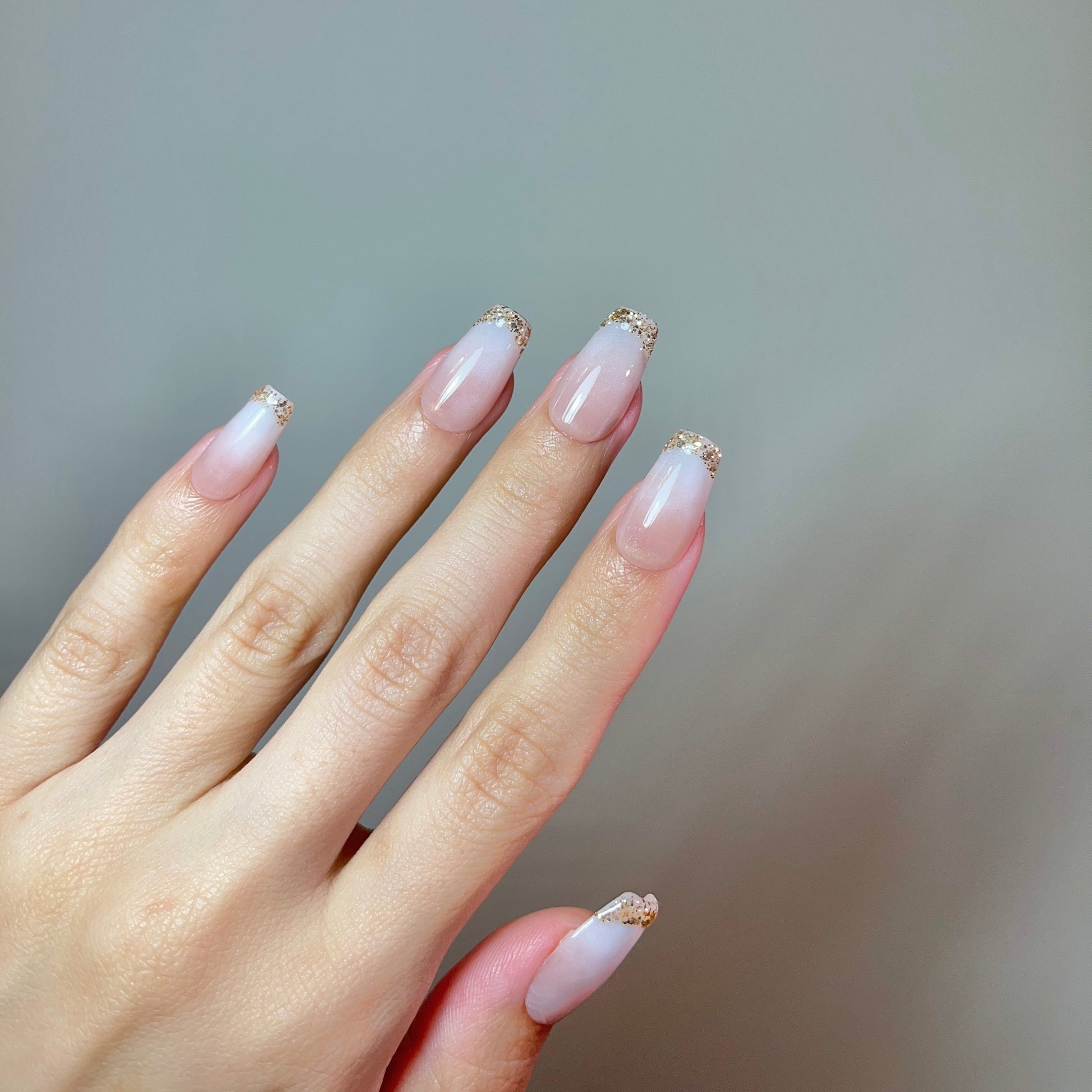 Each READY READY press-on is hand-tested for 30 days to ensure top quality. Sparkle Gold Tip French features a nude base beautifully paired with a shimmering gold sparkle French tip.
