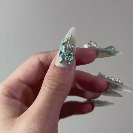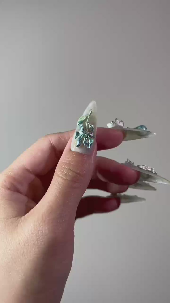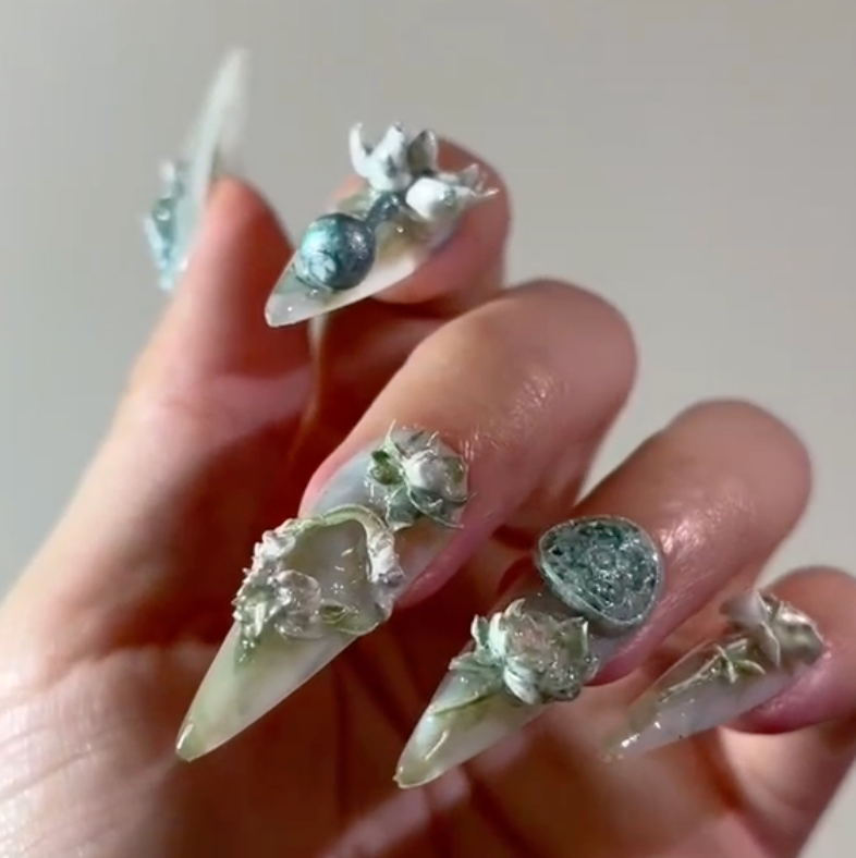 Each READY READY press-on is hand-tested for 30 days to ensure top quality.Green Pool & Flowers features a rich green base with intricate 3D floral designs. Its bold, detailed style adds a luxurious and artistic touch to any manicure. Perfect for a standout, high-fashion look in seconds.