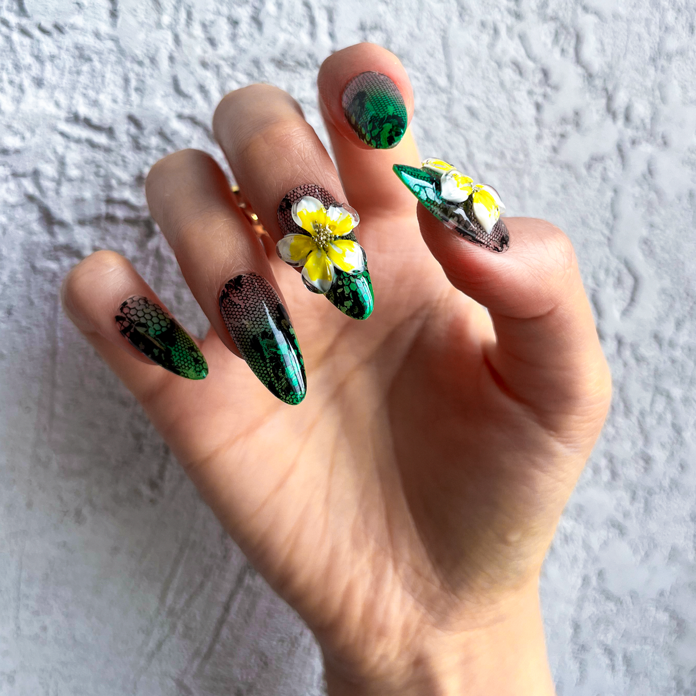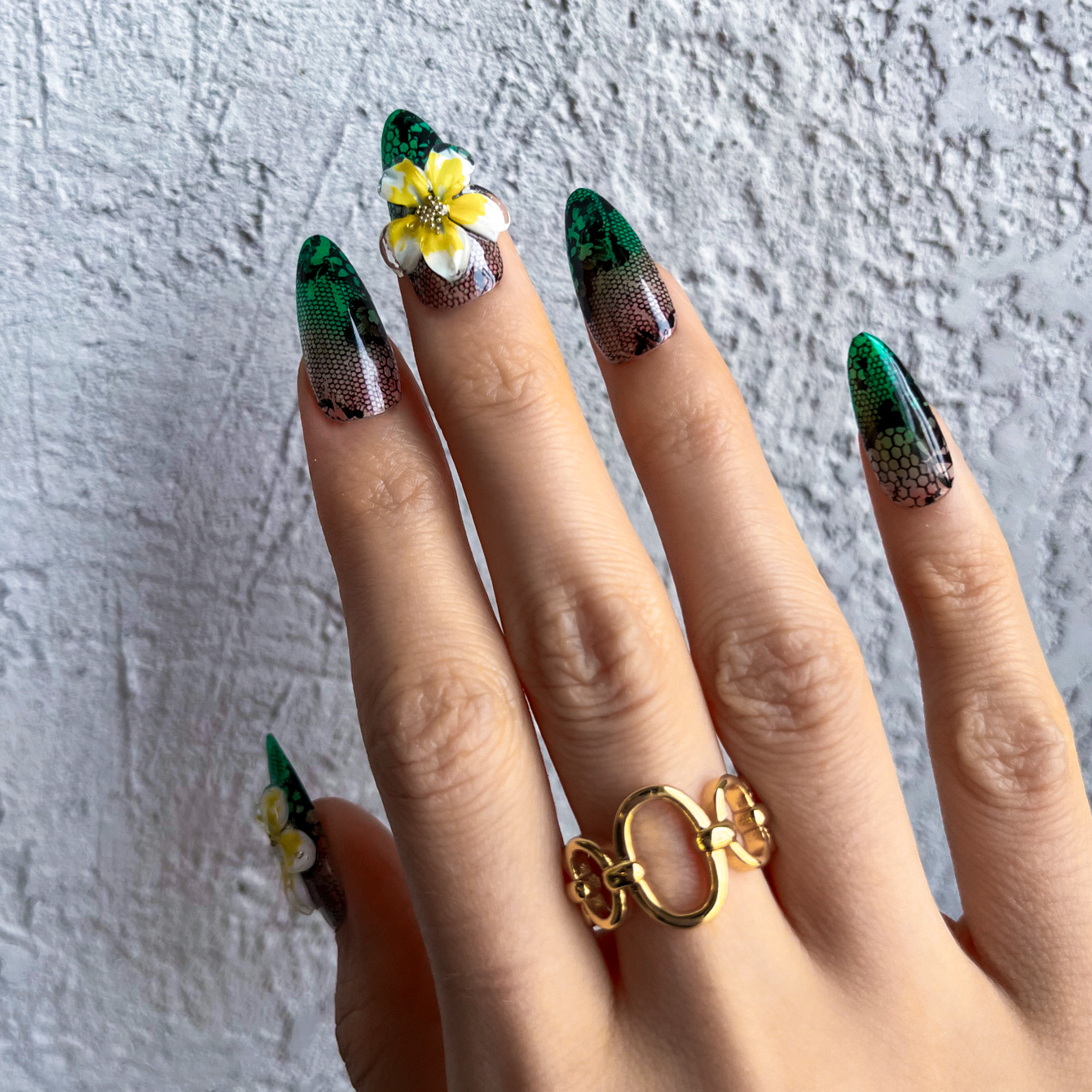Each READY READY press-on is hand-tested for 30 days to ensure top quality. Jungle Éclat handmade luxury almond Japanese press-on nails feature a green and yellow gradient with black lace overlays and dimensional 3D yellow flowers. Reusable and durable, they deliver chic, artistic, and fashion-forward manicures perfect for everyday wear, parties, or bold statement looks with sophisticated, nature-inspired elegance.
