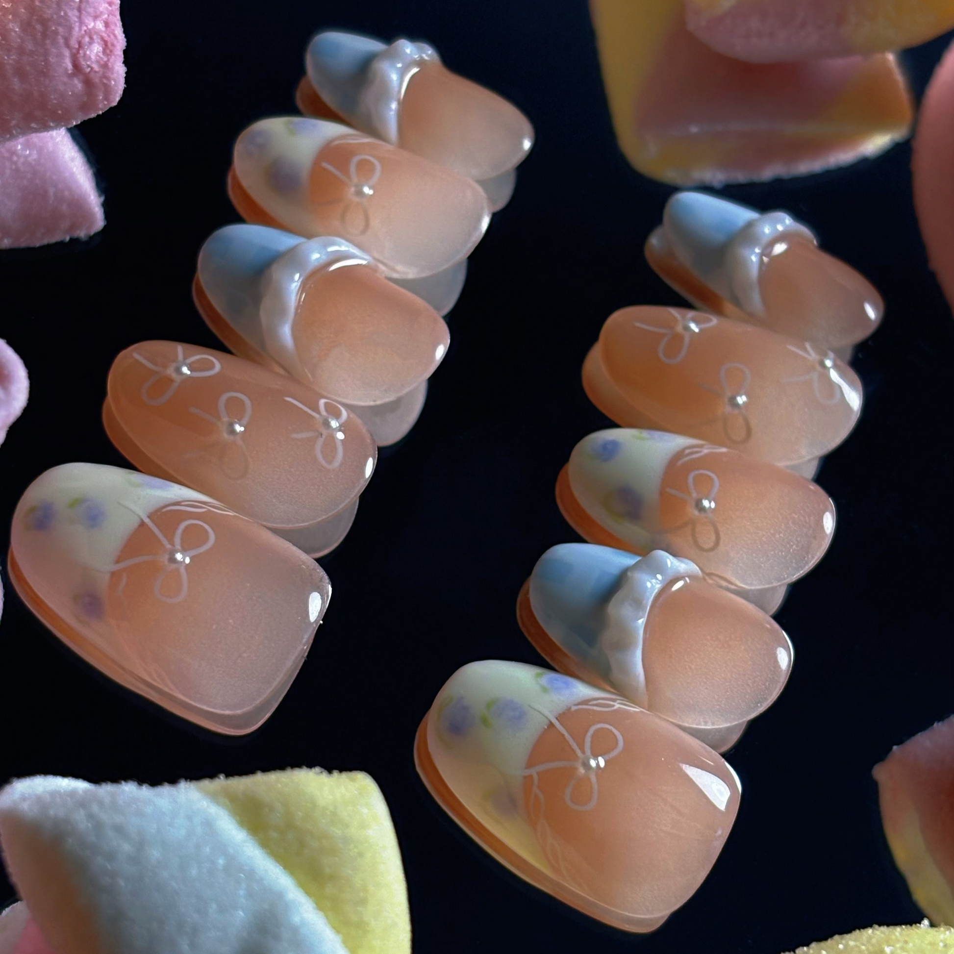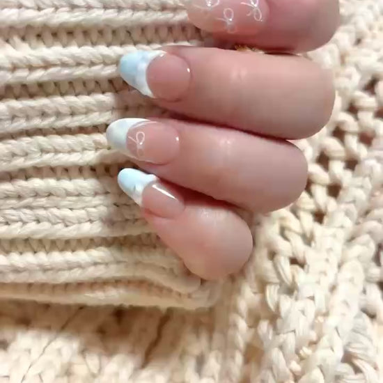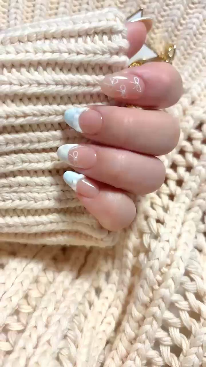 Each READY READY press-on is hand-tested for 30 days to ensure top quality. Kid’s French features a nude base with white and blue French tips, adorned with delicate flower and ribbon patterns. Its charming, garden-party-inspired design adds a whimsical and elegant touch to any manicure.