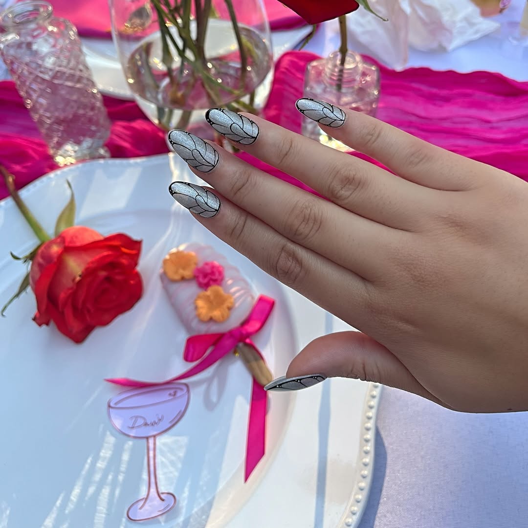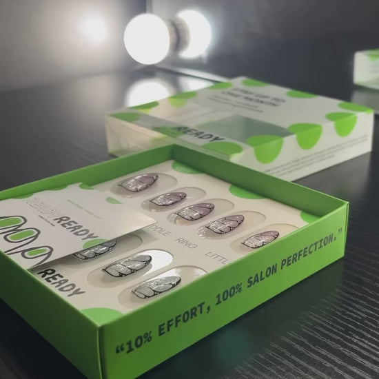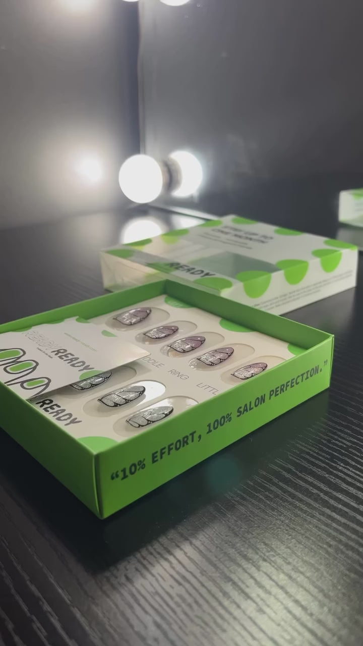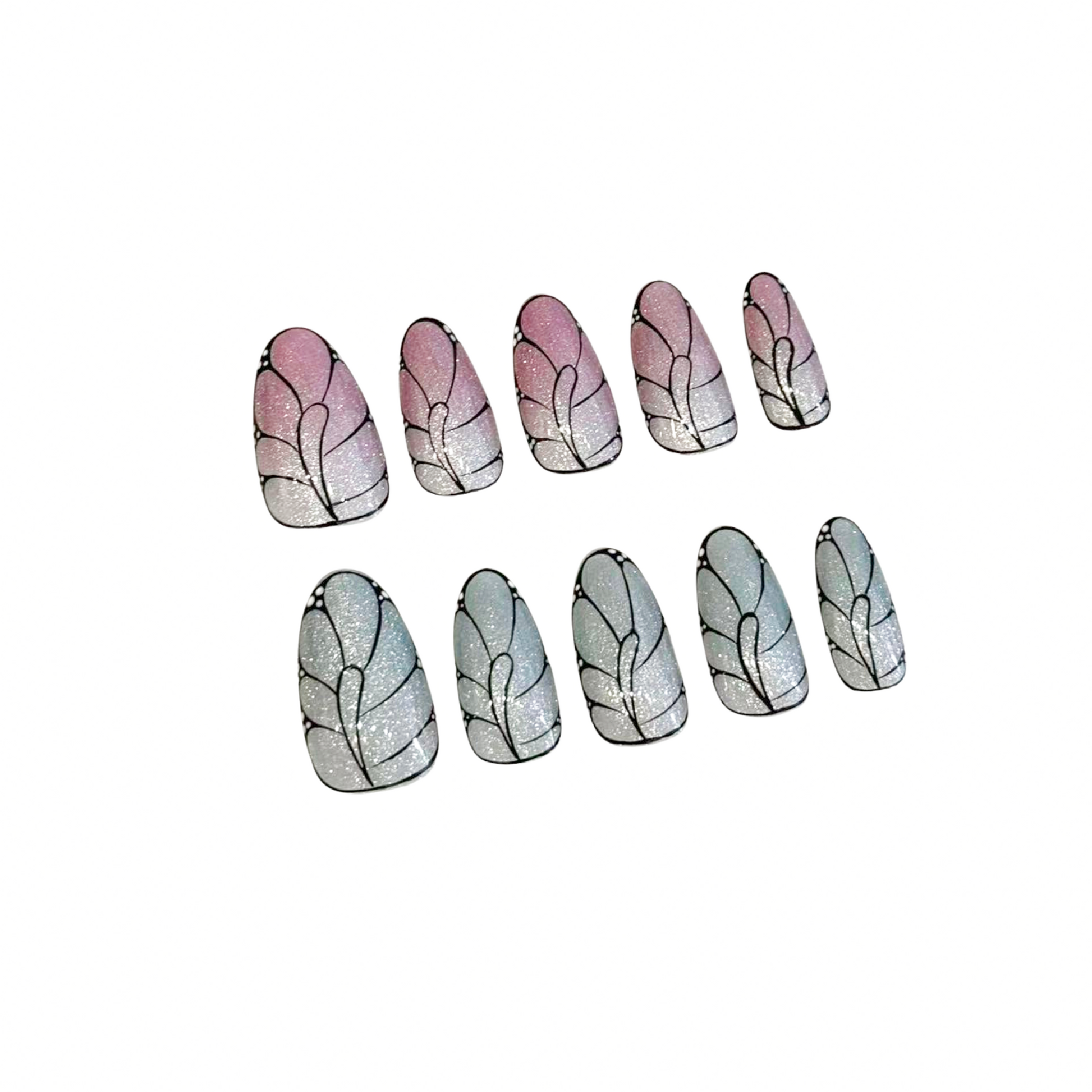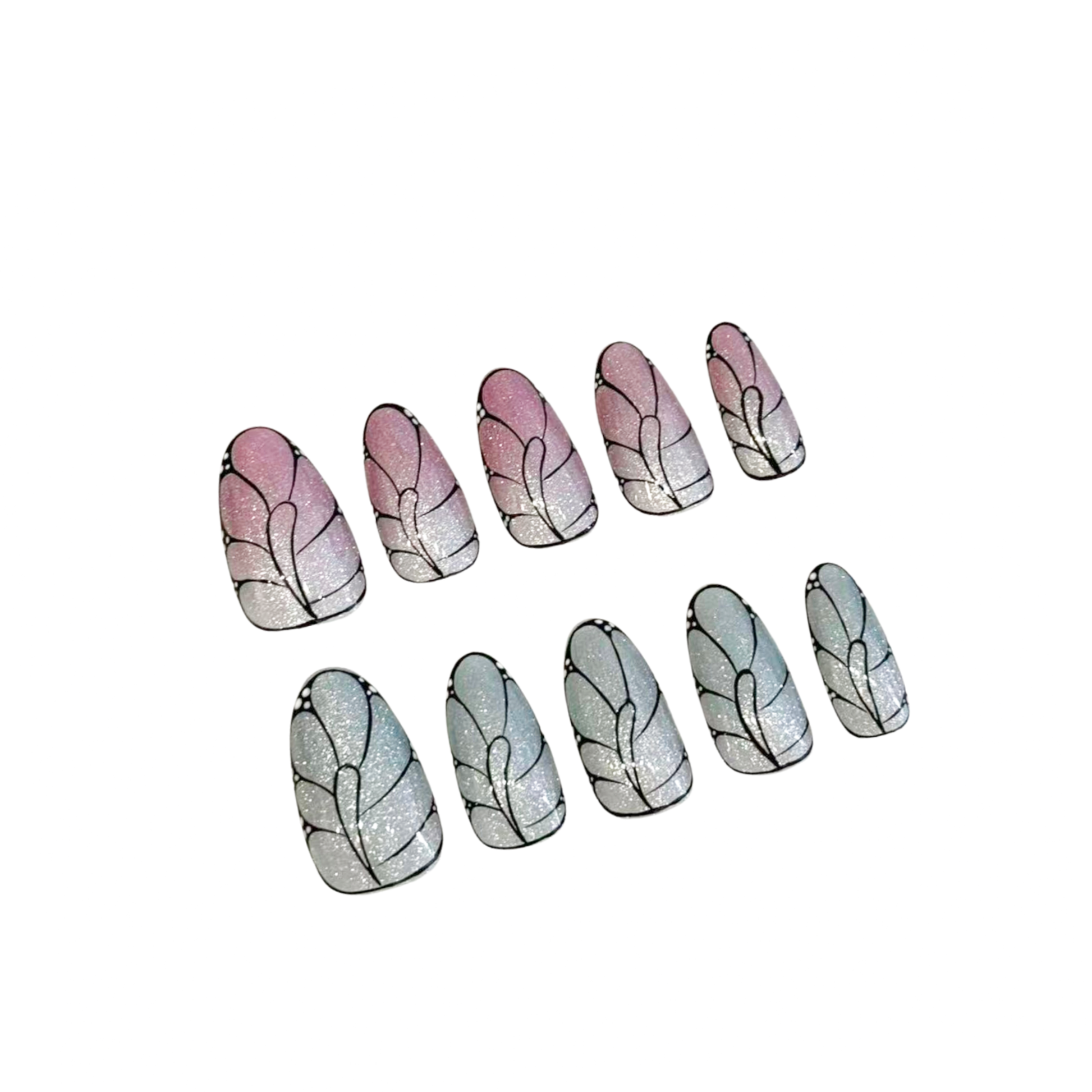 Each READY READY press-on is hand-tested for 30 days to ensure top quality.Kocho features a silver glitter base with pink and blue gradient tips, adorned with delicate butterfly wing patterns. Its whimsical, elegant design adds a playful and eye-catching touch to any manicure.