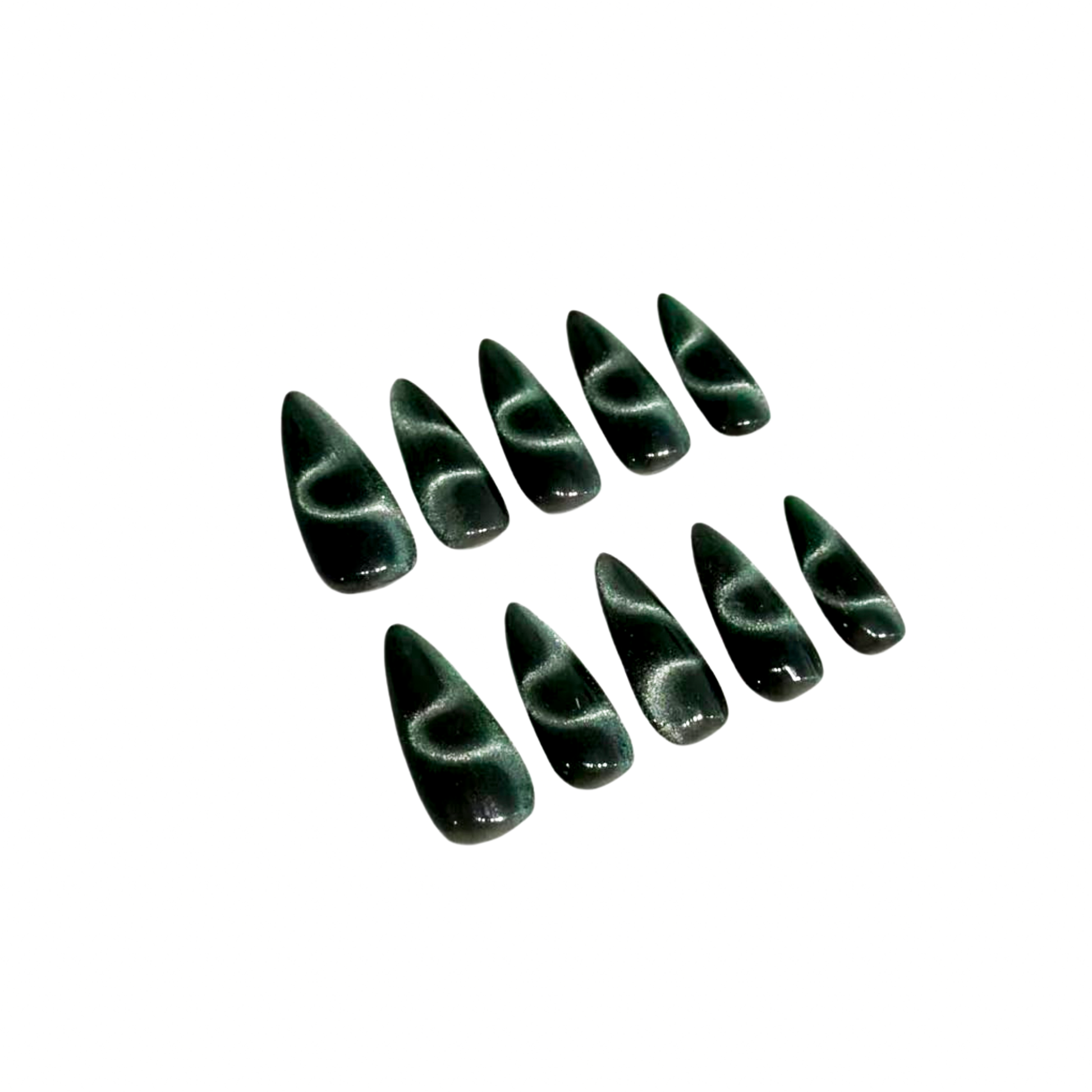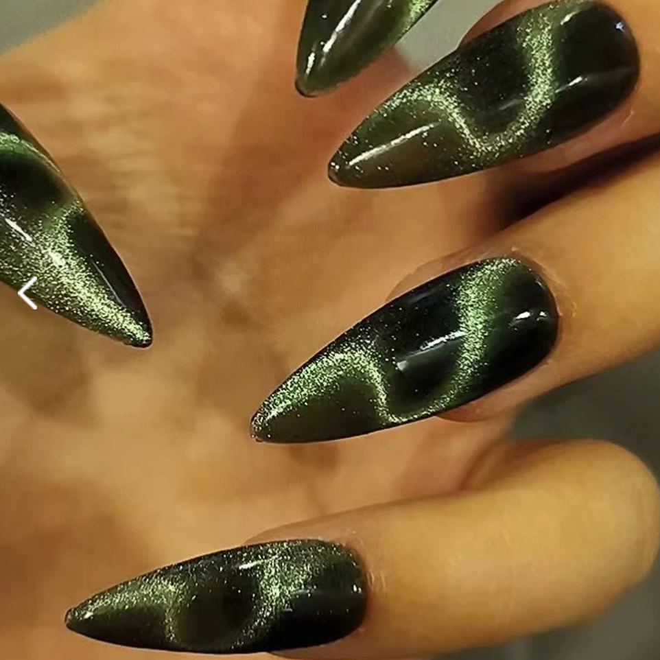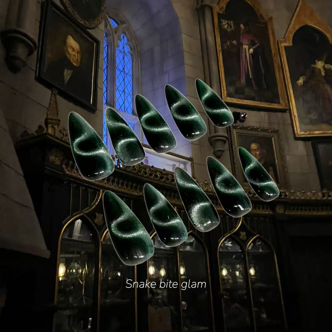 Each READY READY press-on is hand-tested for 30 days to ensure top quality. Mamba features a dark green cat-eye effect shaped like a slithering snake. Its bold, edgy design adds a striking and mysterious touch to any manicure. Perfect for a standout, fashion-forward look in seconds.