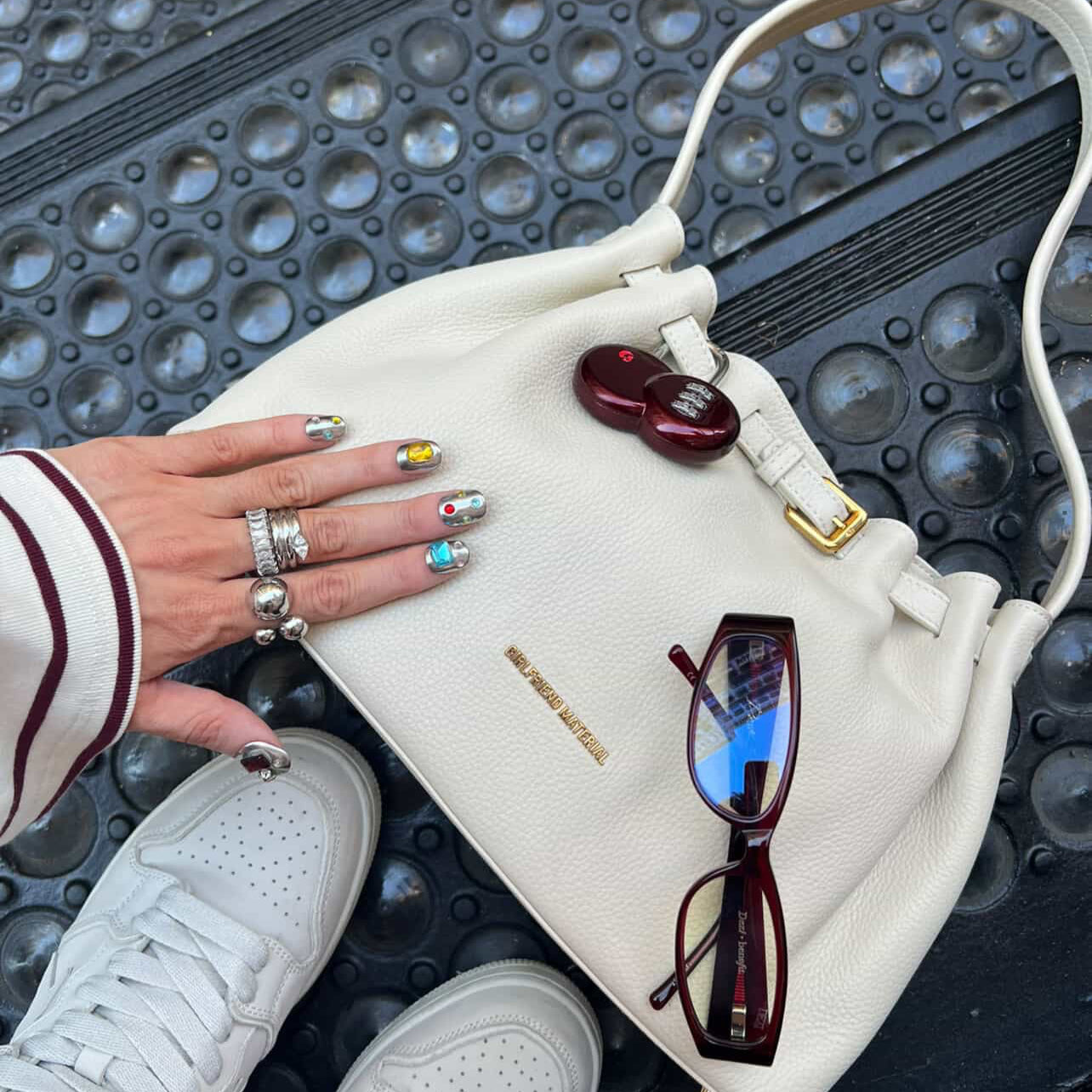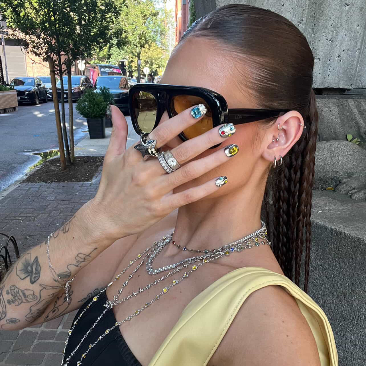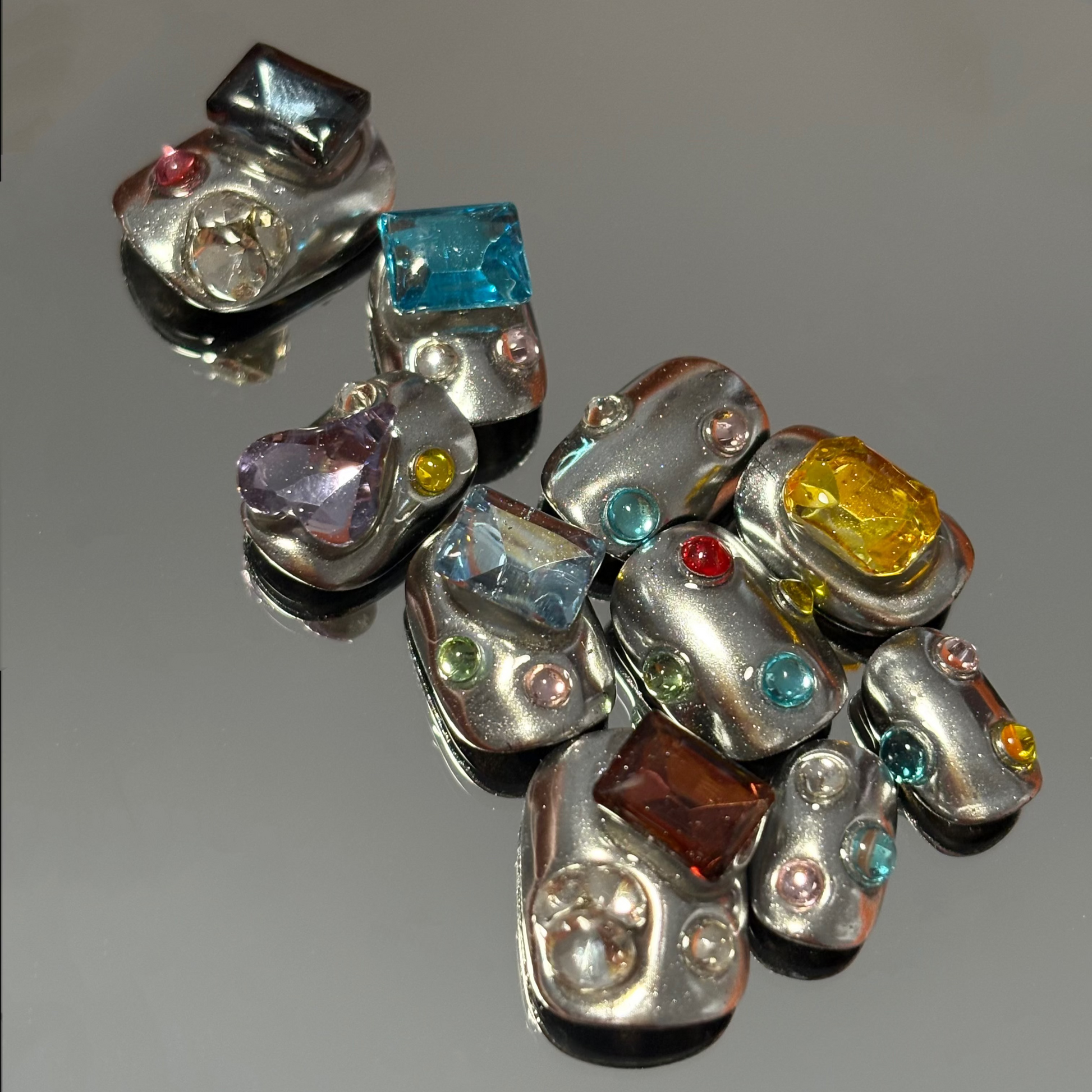 Each READY READY press-on is hand-tested for 30 days to ensure top quality. Metallic Treasure features a silver chrome base adorned with colorful rhinestones in various shapes. Its dazzling, playful design adds a glamorous and eye-catching touch to any manicure.