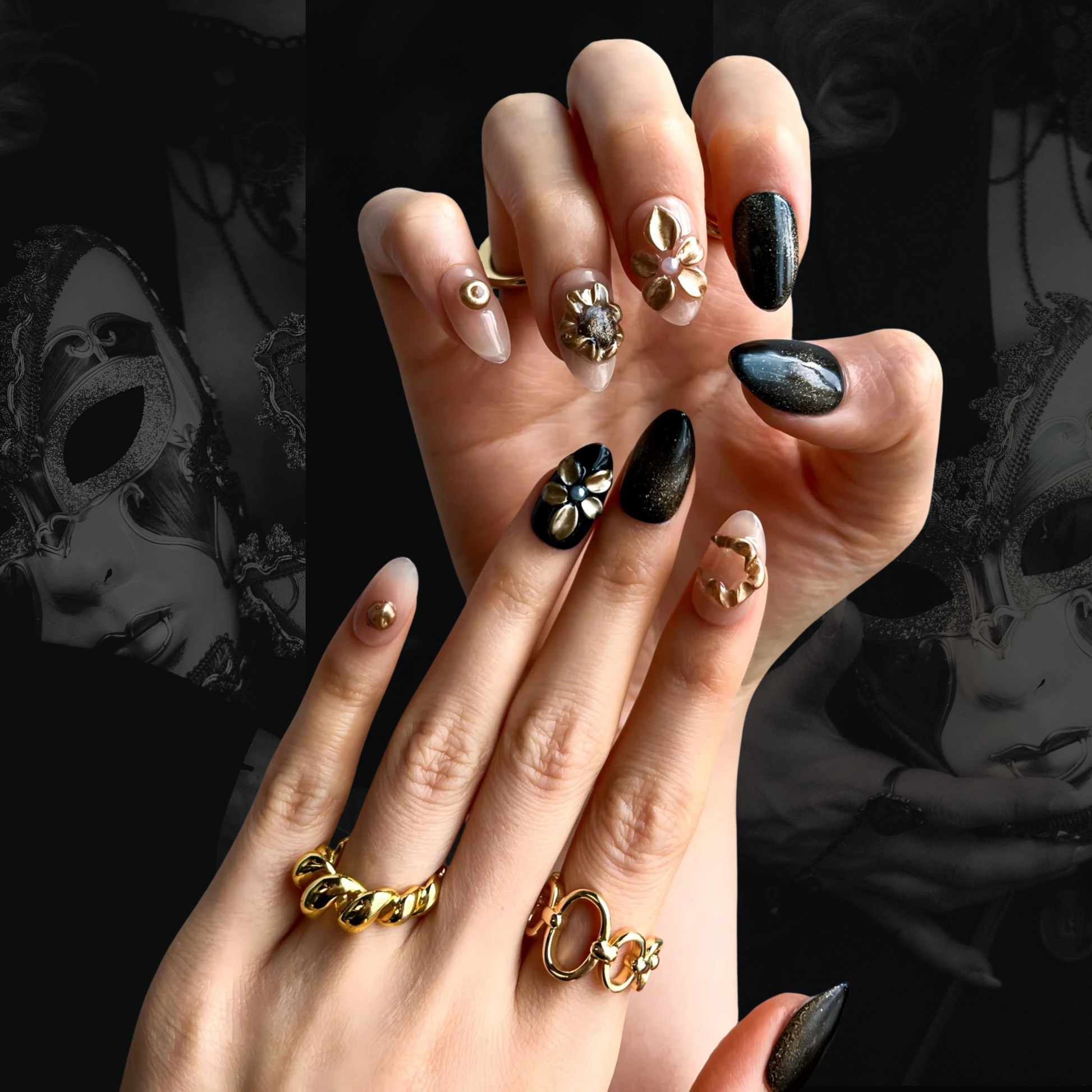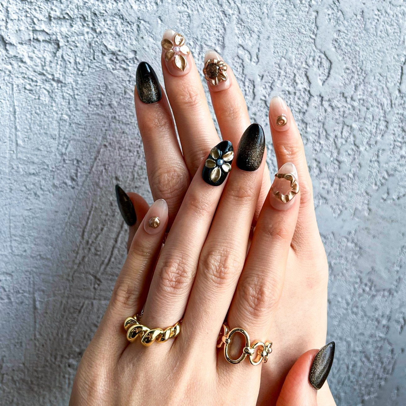 Each READY READY press-on is hand-tested for 30 days to ensure top quality. These handmade luxury almond Japanese press-on nails feature a striking black and gold base with a cat-eye vintage effect and a delicate 3D gold flower. Reusable and durable, they deliver chic, stylish, and fashion-forward manicures perfect for everyday wear, parties, or elegant, statement-making looks.