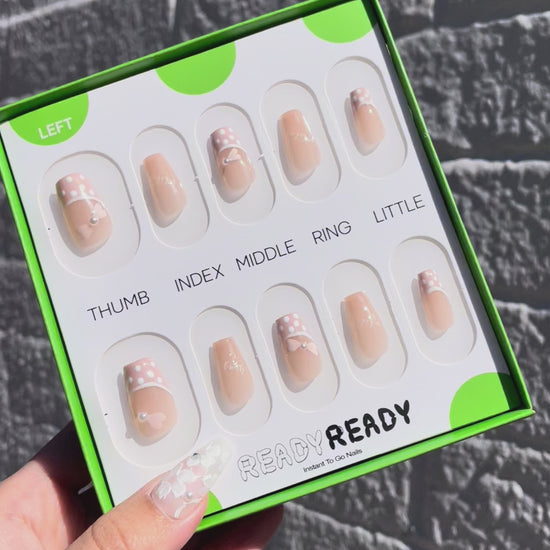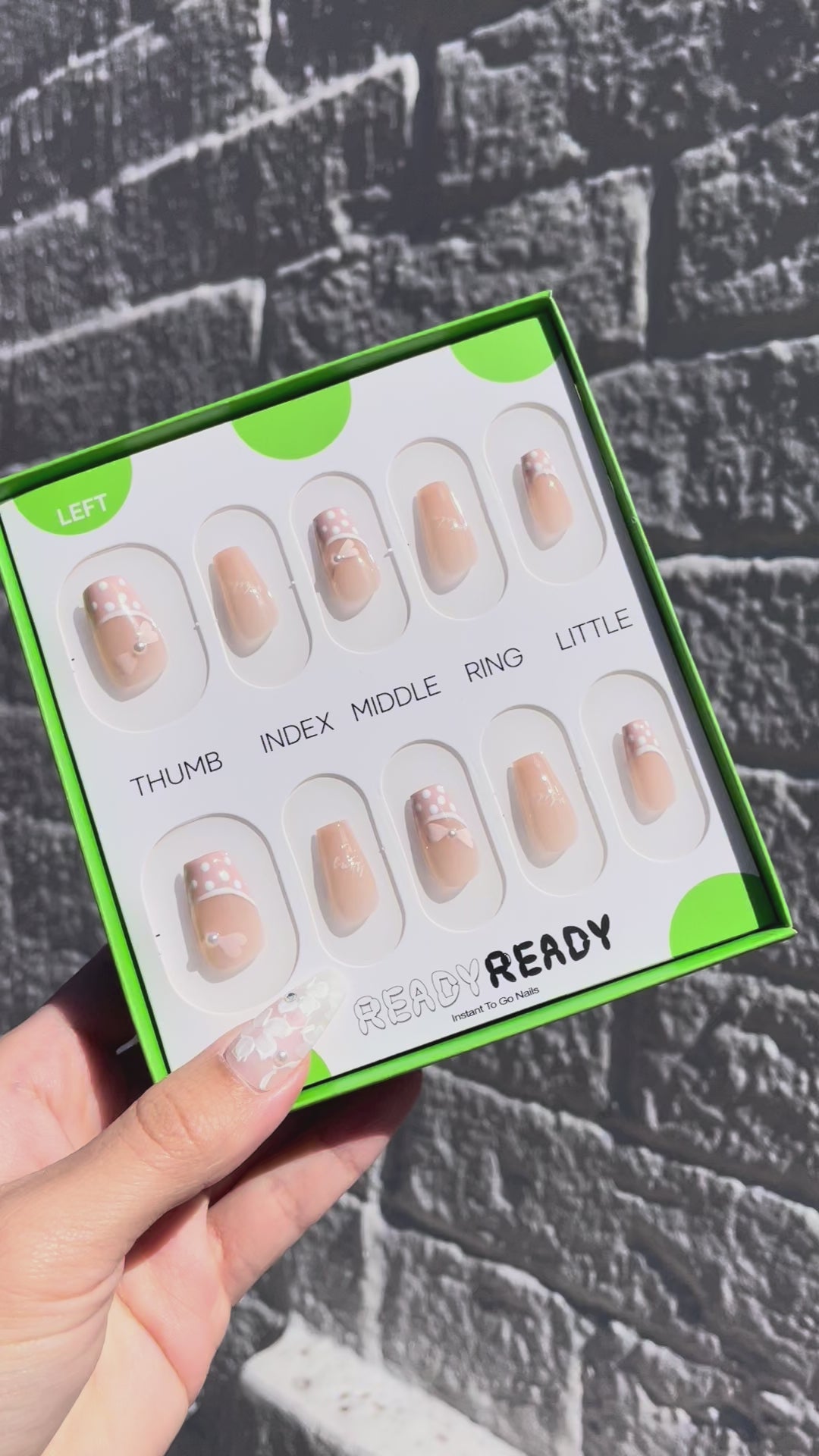 Each READY READY press-on is hand-tested for 30 days to ensure top quality.Nude Bow features a nude base with pink French tips accented by playful polka dots. Its sweet, feminine design adds a charming and stylish touch to any manicure. Perfect for a standout, cute look in seconds.