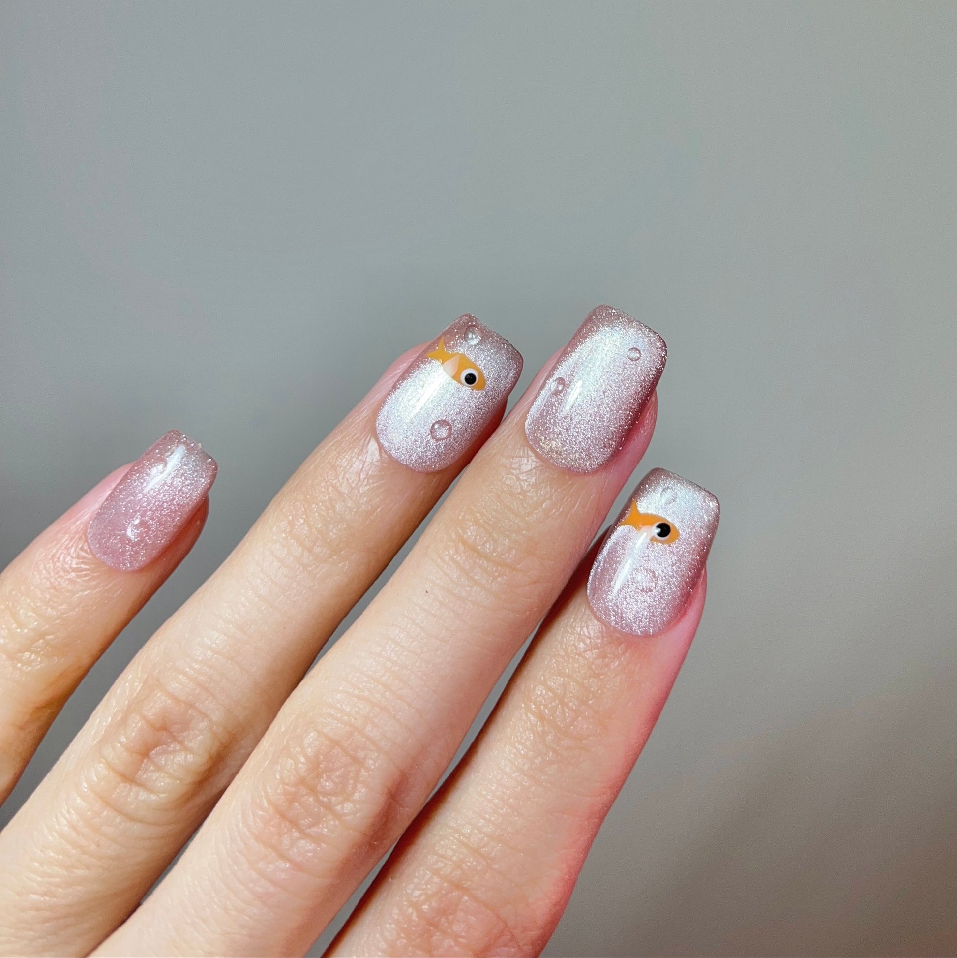 Each READY READY press-on is hand-tested for 30 days to ensure top quality.Pink Gold Fish features a pink cat-eye base adorned with a delicate gold fish design. Its elegant, whimsical style adds a playful and luxurious touch to any manicure. Perfect for a standout, charming look in seconds.