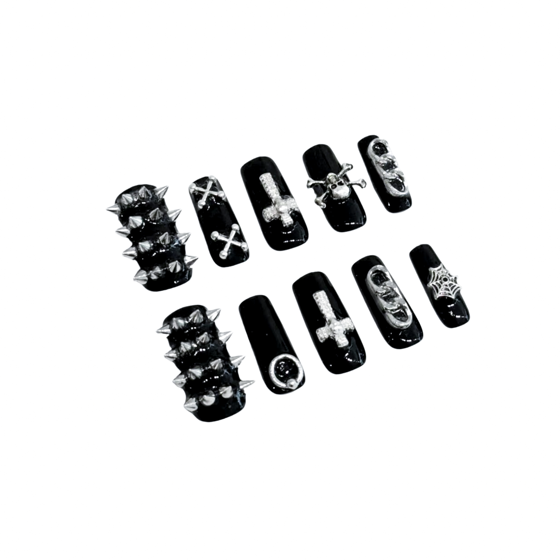 Each READY READY press-on is hand-tested for 30 days to ensure top quality. Rock N Roll features a bold black base adorned with edgy metal decorations. Its rebellious, stylish design adds a striking and dramatic touch to any manicure. Perfect for a standout, fashion-forward look in seconds.