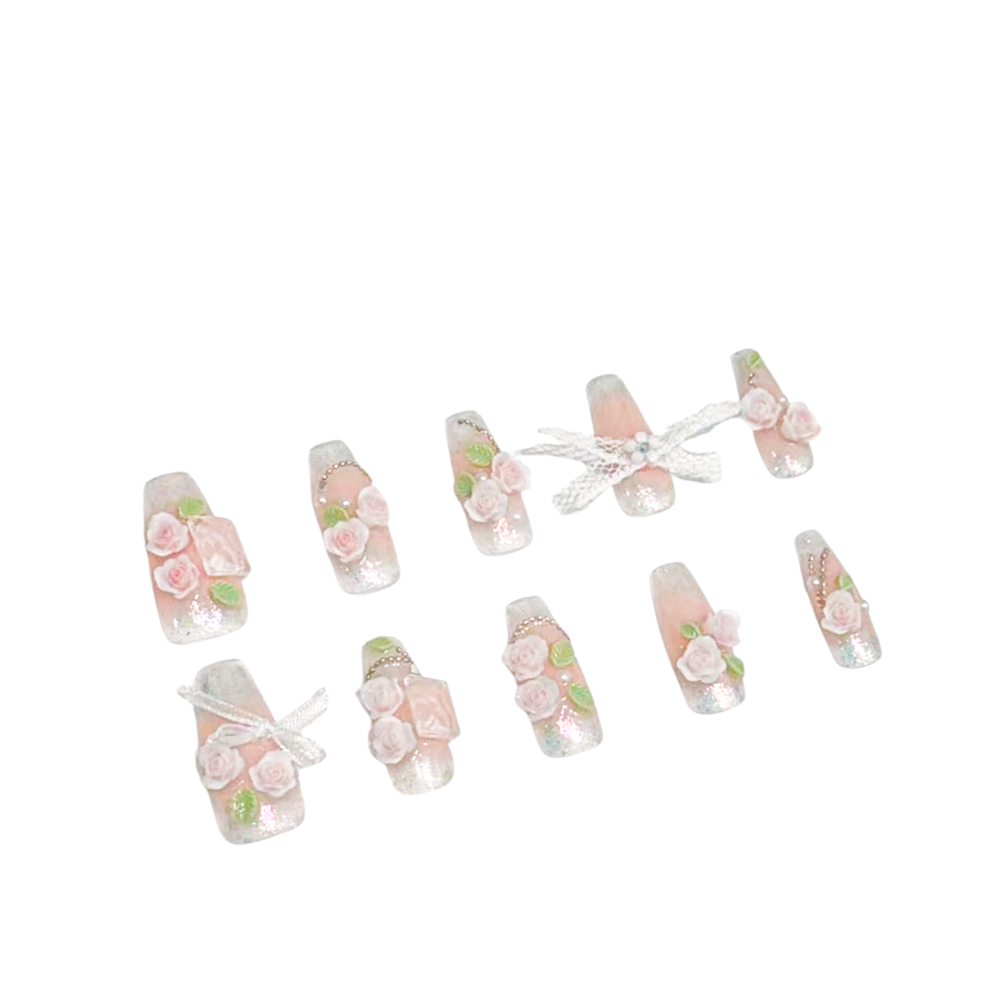 Each READY READY press-on is hand-tested for 30 days to ensure top quality.Royal Courtyard features a silk white base adorned with delicate 3D pink flower bouquets. Its elegant, feminine design adds a graceful and luxurious touch to any manicure. Perfect for a standout, sophisticated look in seconds.