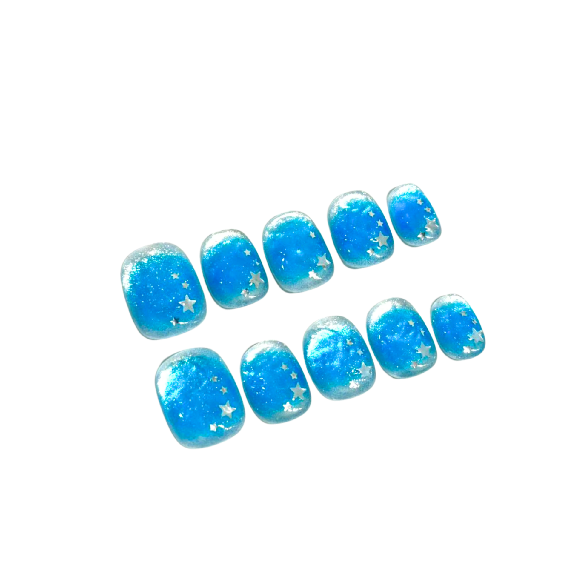 Each READY READY press-on is hand-tested for 30 days to ensure top quality. Sparkling Soda features a shimmering silver base accented by a vibrant blue center, creating a dynamic effect reminiscent of sparkling soda bubbles.