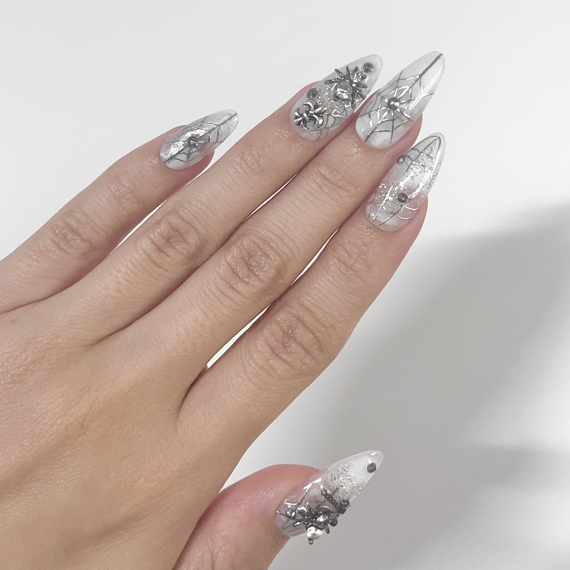 Each READY READY press-on is hand-tested for 30 days to ensure top quality. Spider features a milky white base elegantly contrasted by intricate black paintings of a spider and web.