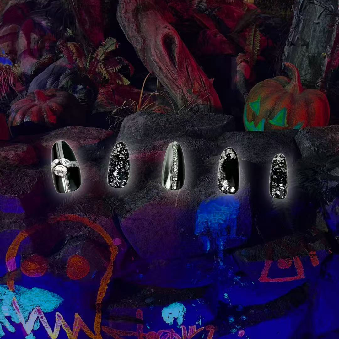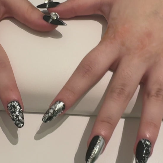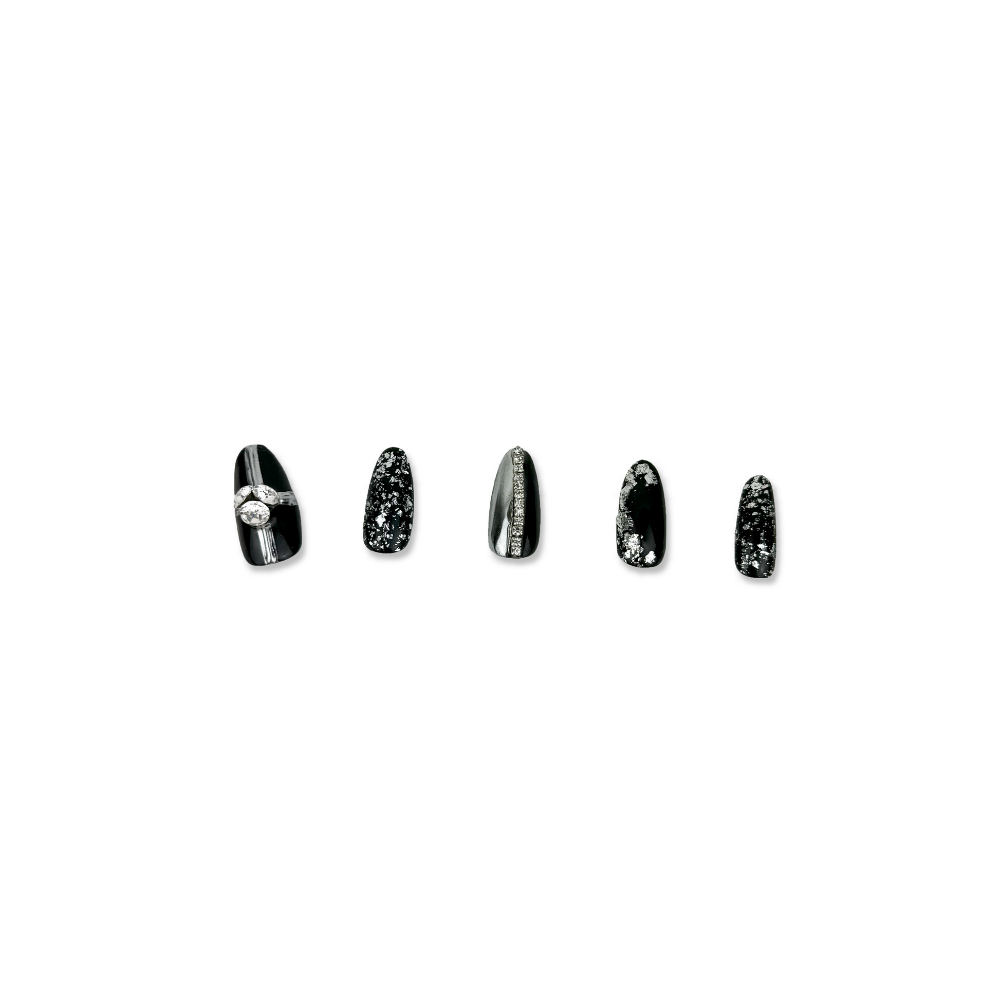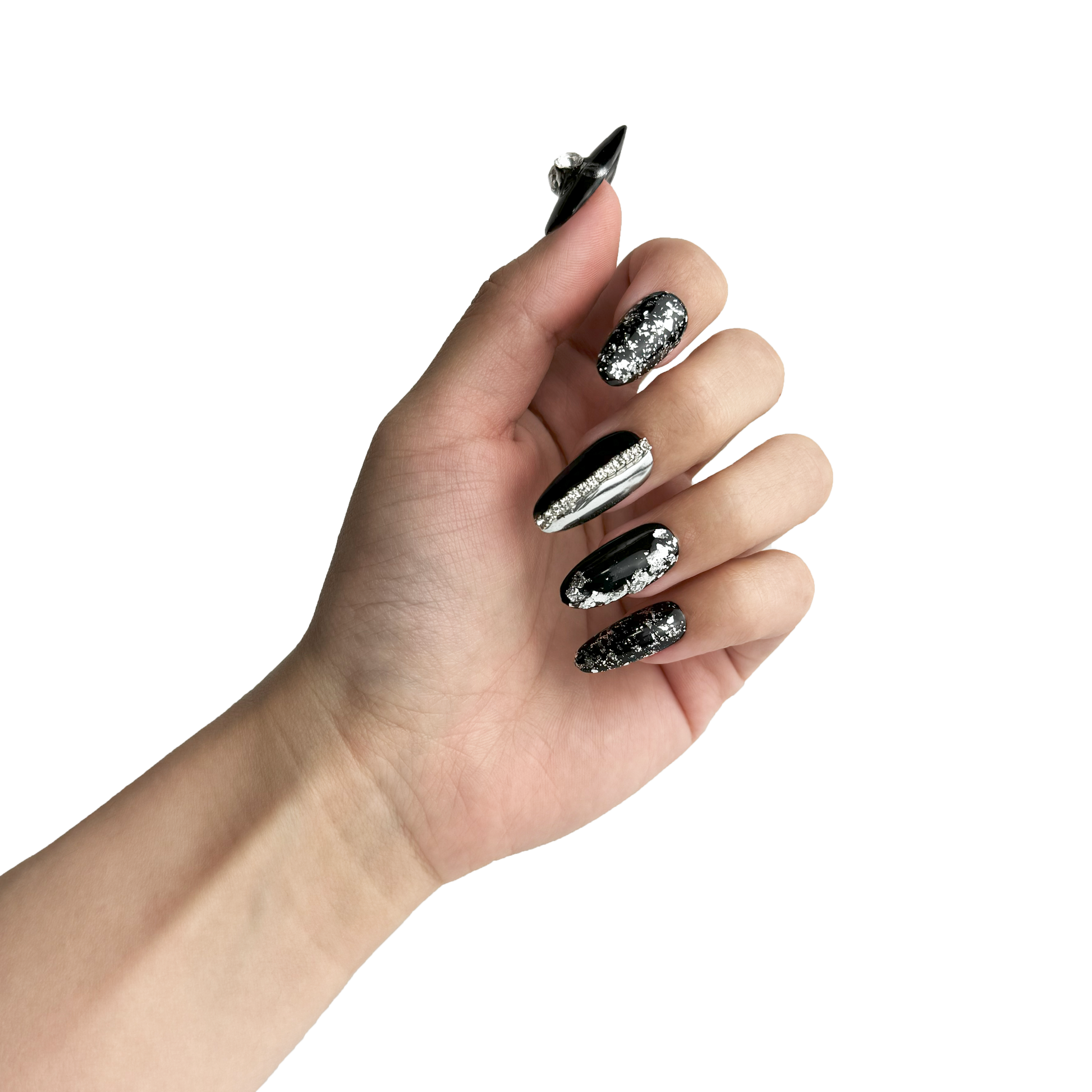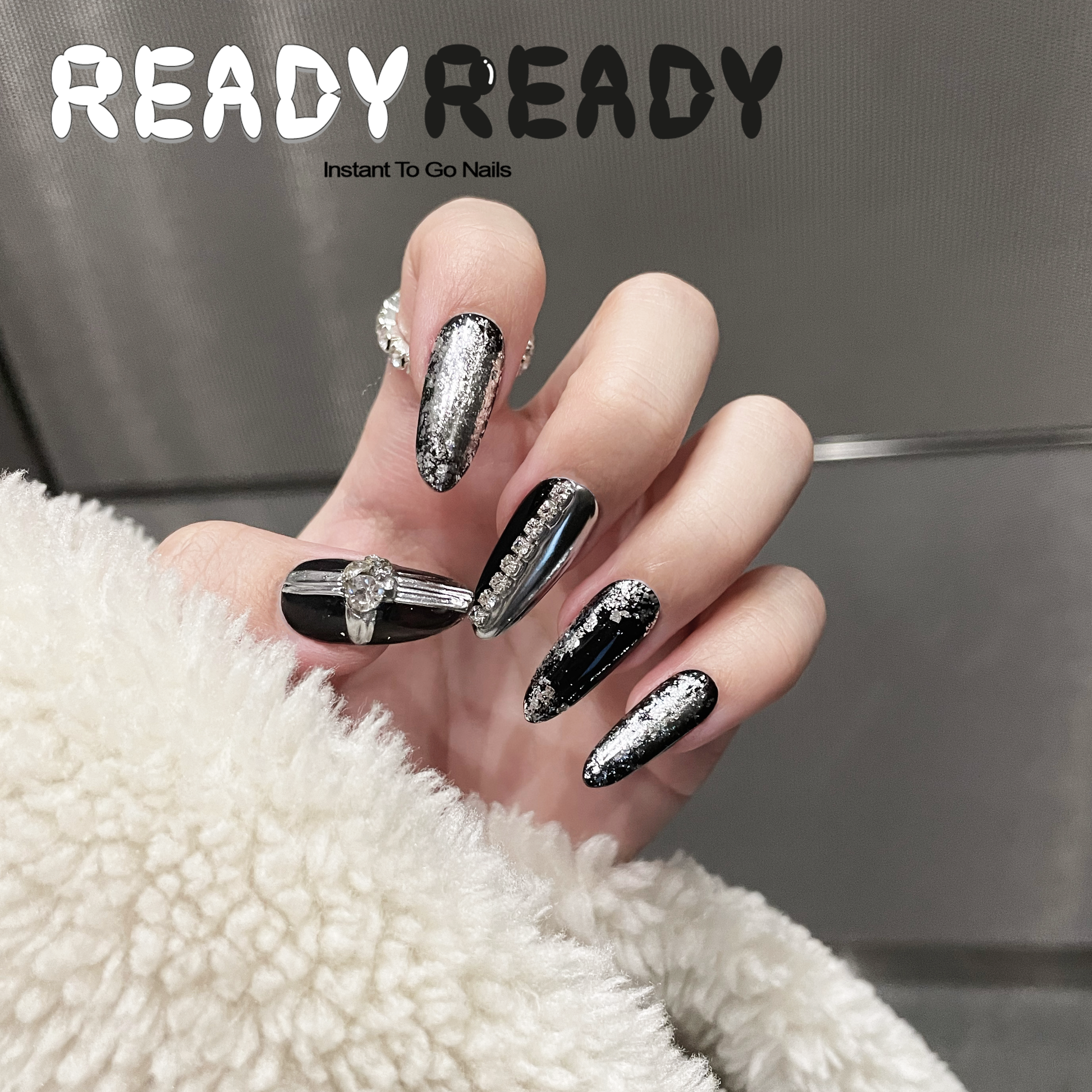 Each READY READY press-on is hand-tested for 30 days to ensure top quality. Stardust features a striking black base accented with silver chrome power elements and sparkling rhinestones.