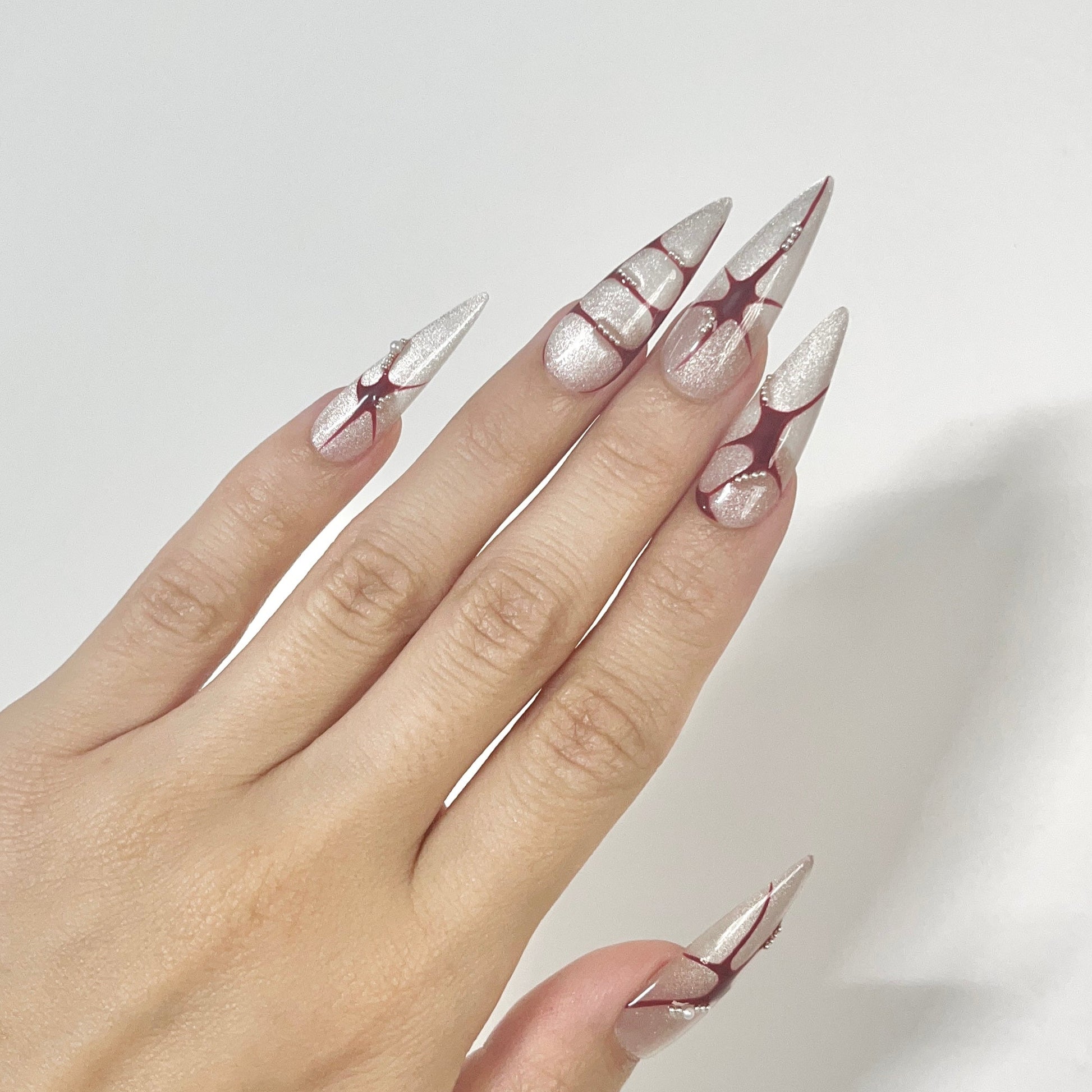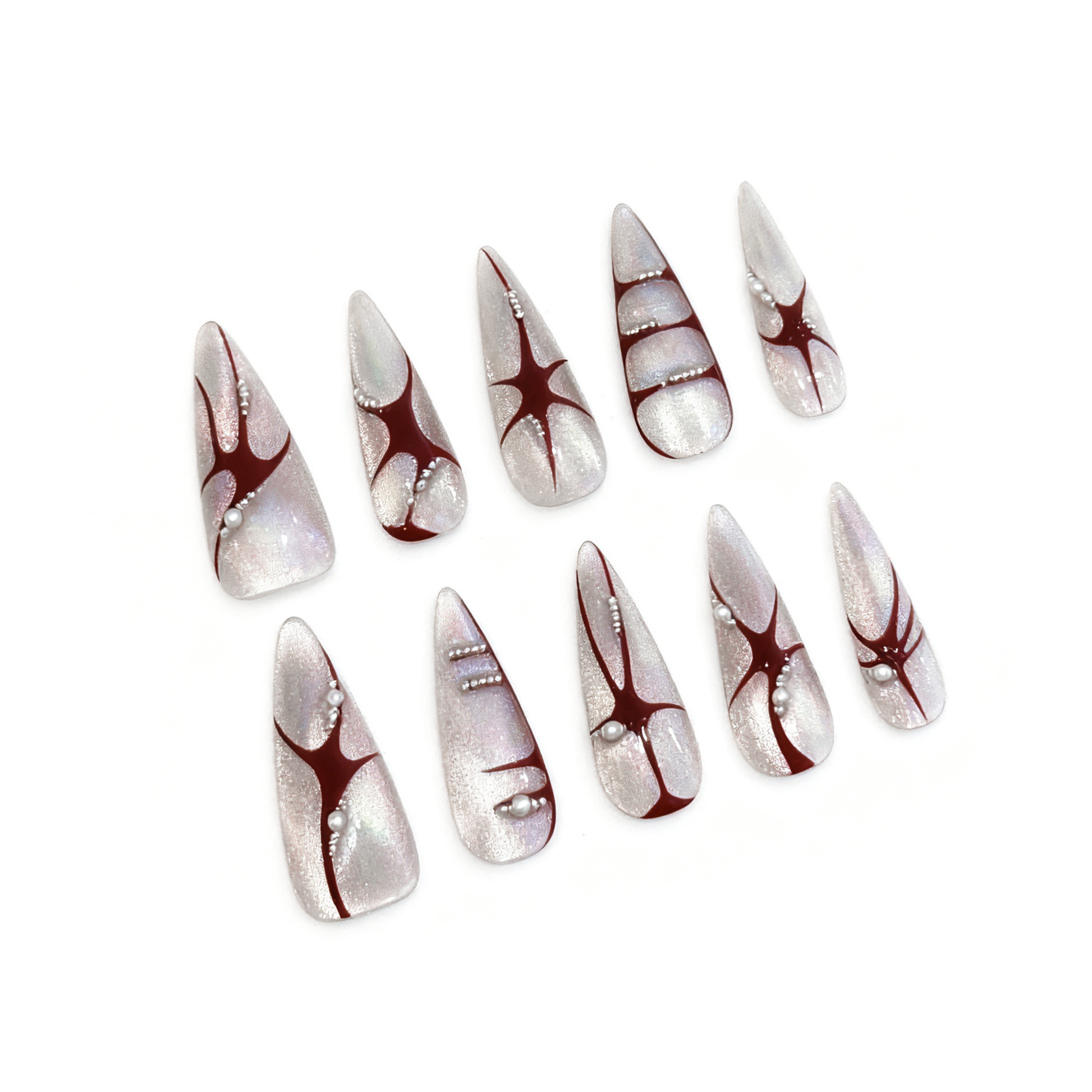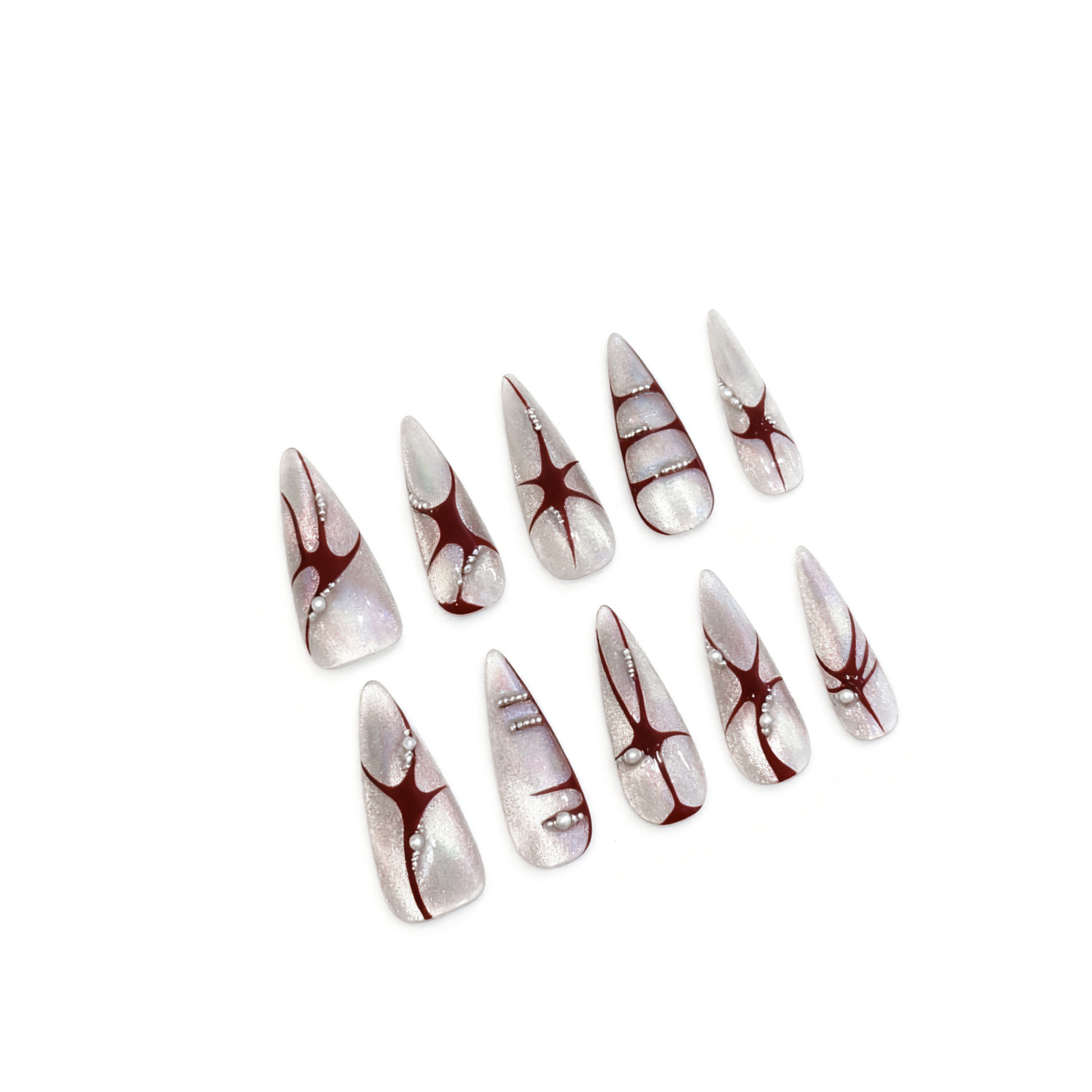 Each READY READY press-on is hand-tested for 30 days to ensure top quality. Stellar Spark features a pristine white base enhanced with a luminous pearl chrome effect, beautifully accented by precise red line paintings.