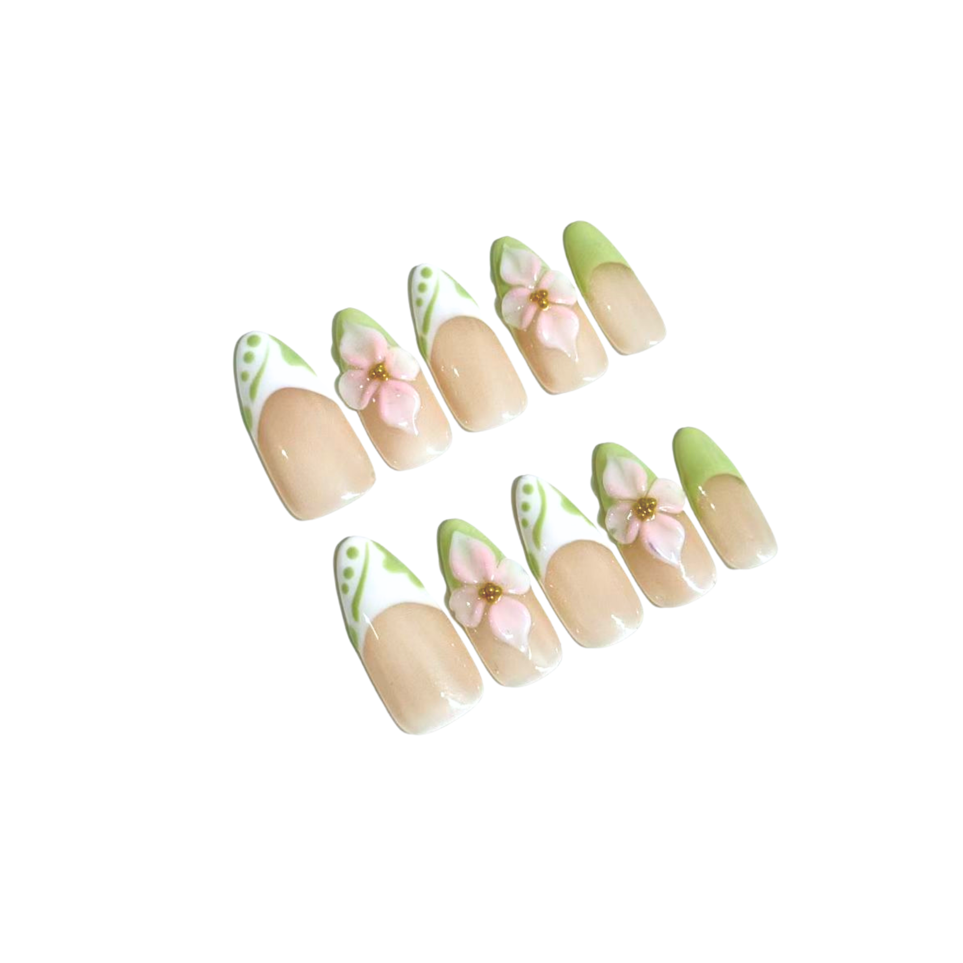 Each READY READY press-on is hand-tested for 30 days to ensure top quality. Fresh Meadow features a crisp green and white French tip beautifully accented with delicate pink 3D floral details.