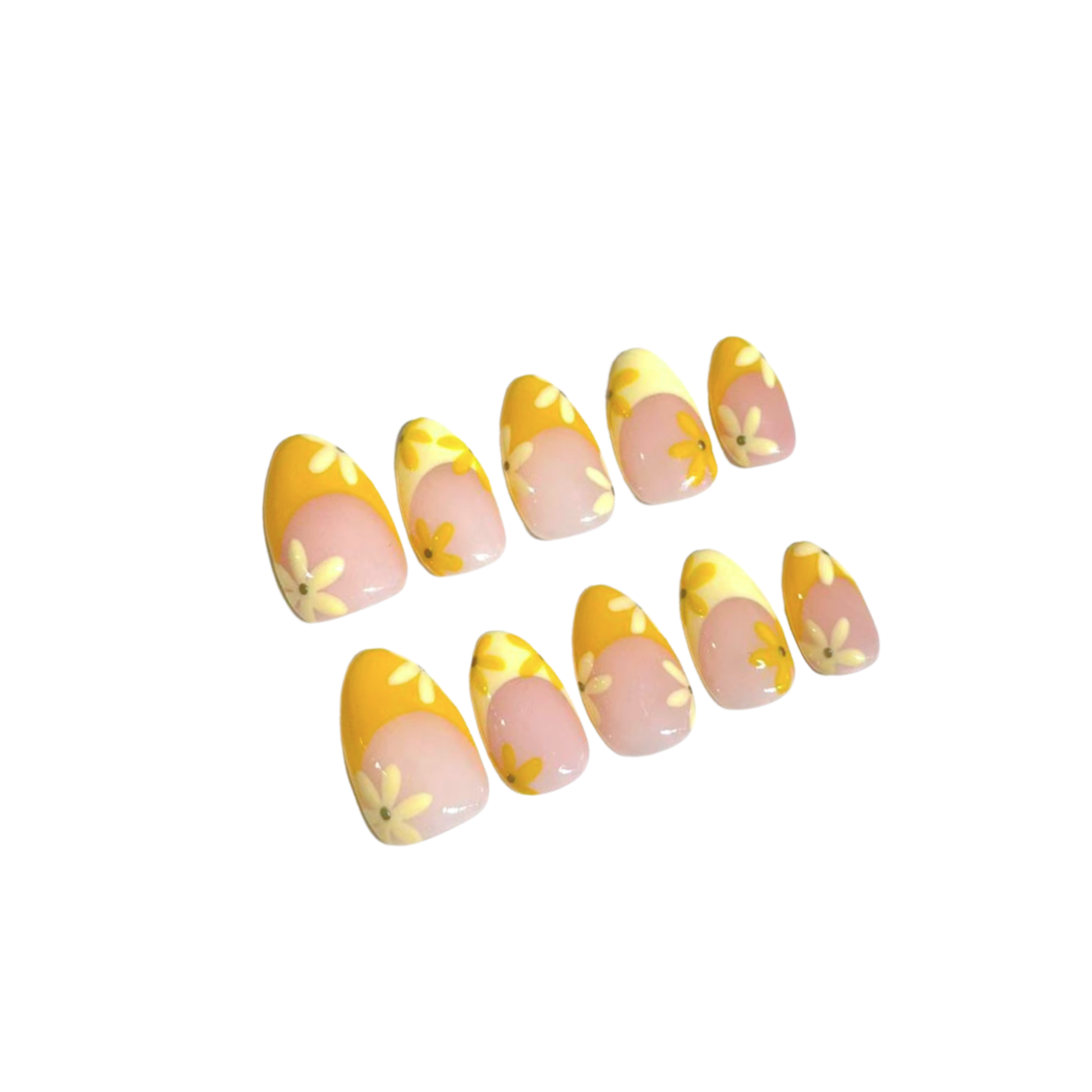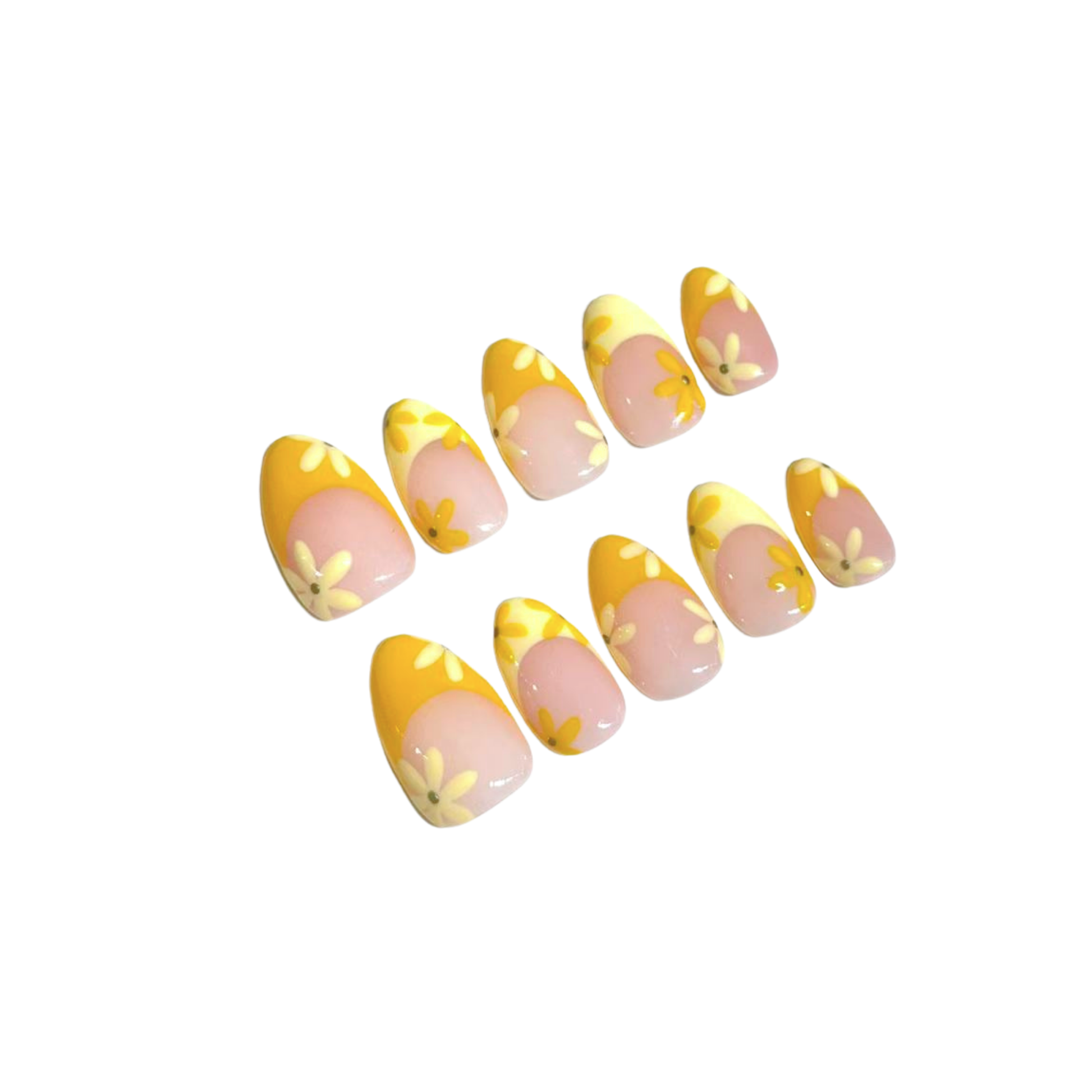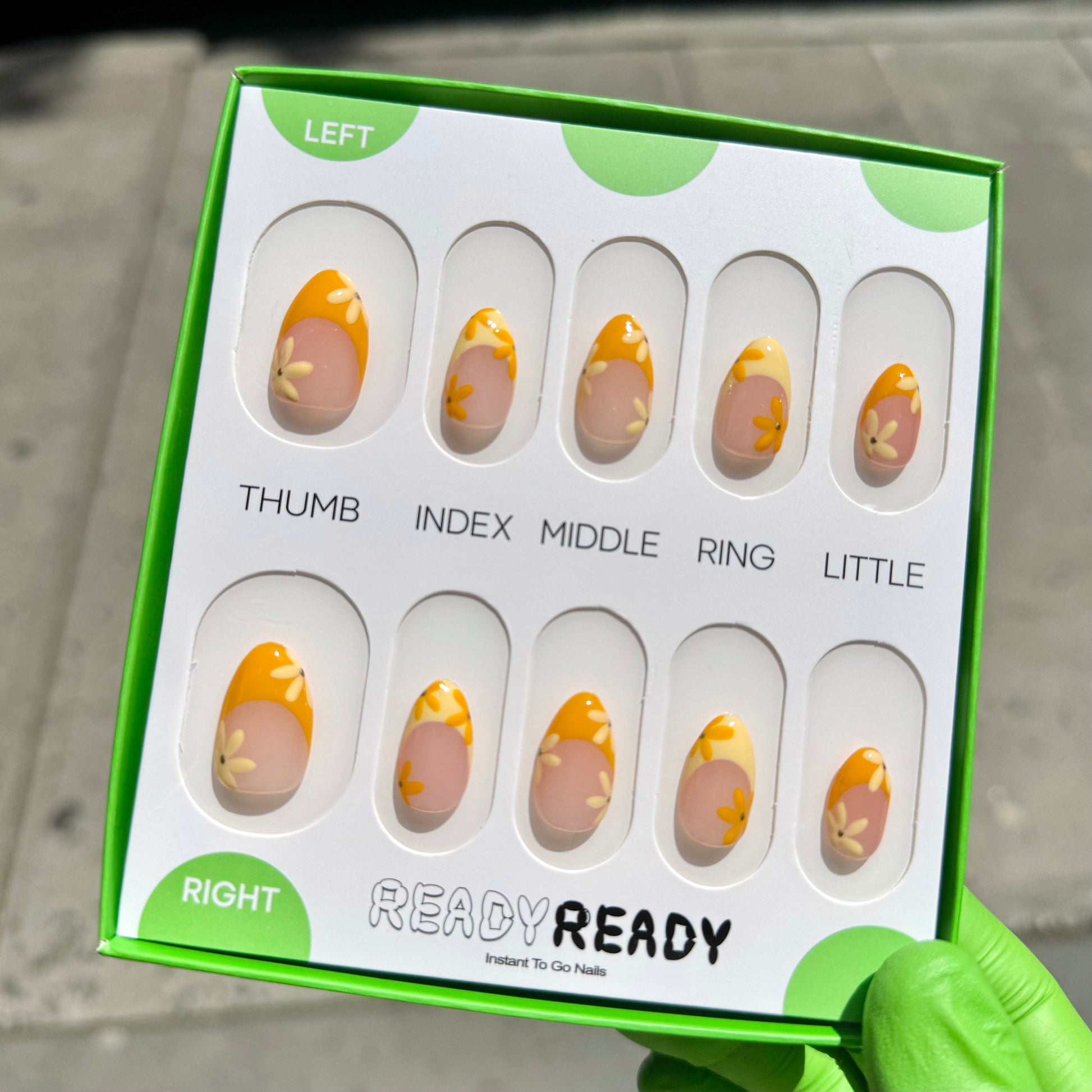 Each READY READY press-on is hand-tested for 30 days to ensure top quality. Floral Drizzle features a bright yellow French tip adorned with delicate yellow floral accents.