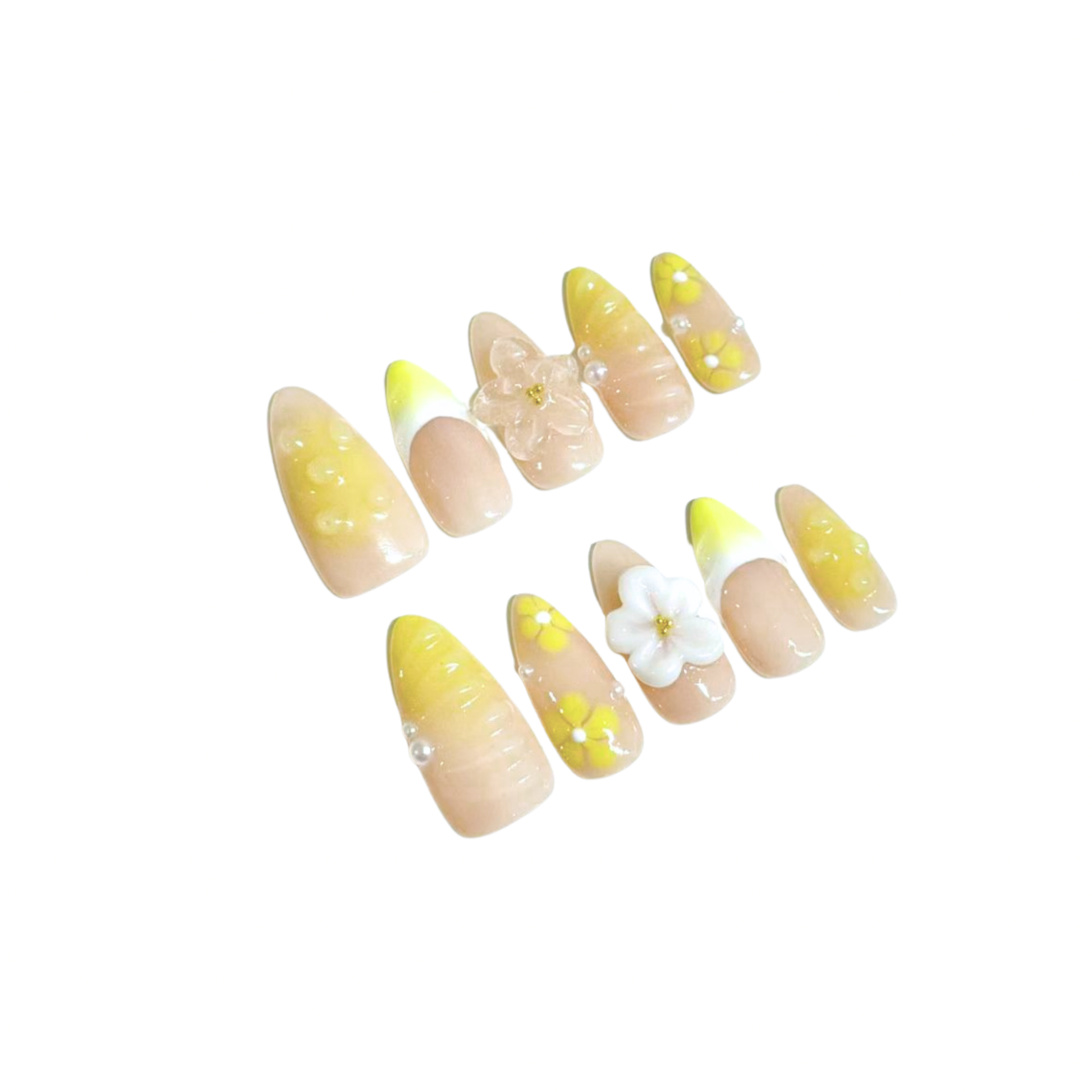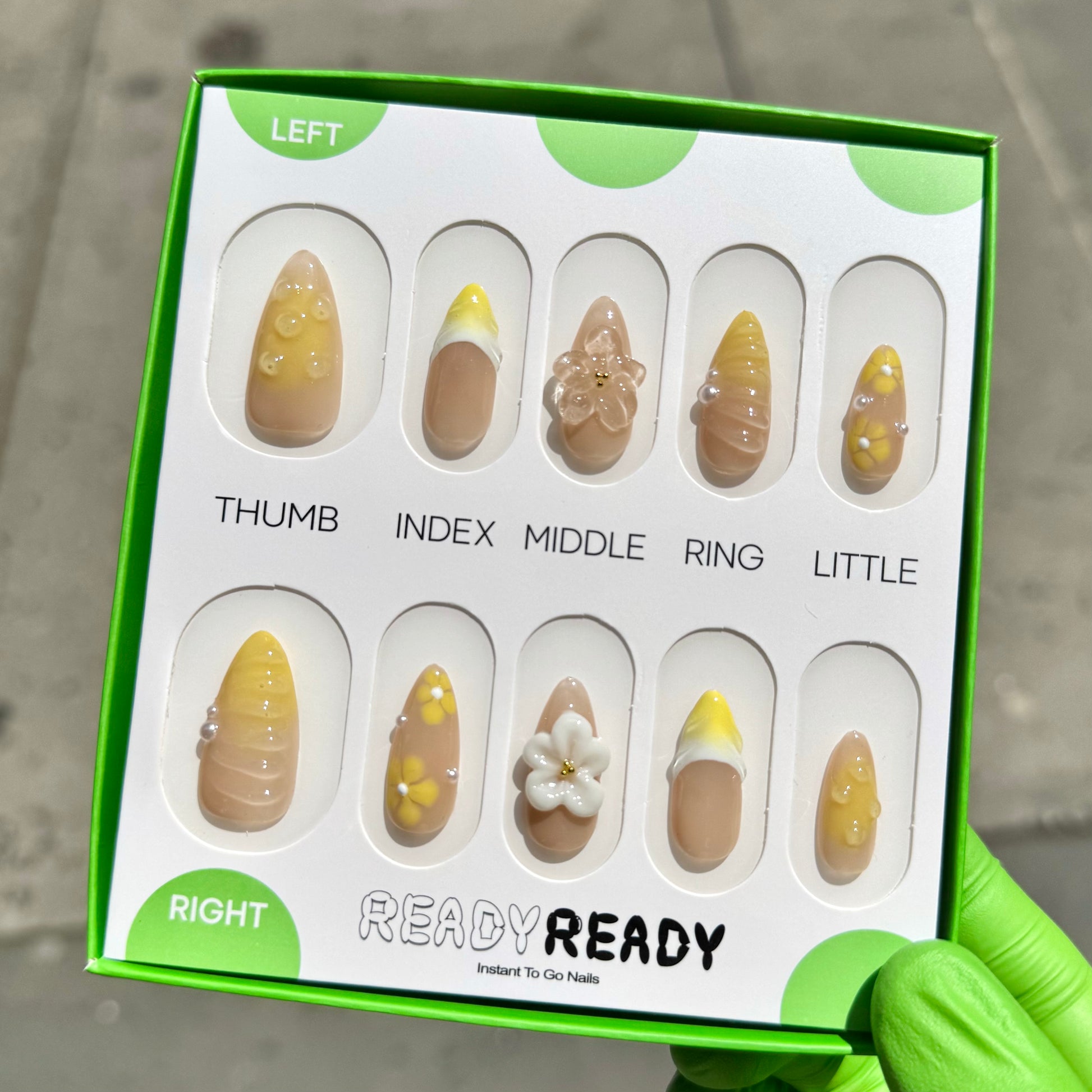 Each READY READY press-on is hand-tested for 30 days to ensure top quality. Lemon Tree showcases a soft nude base paired with a vibrant lemon yellow French tip and intricate 3D floral accents.