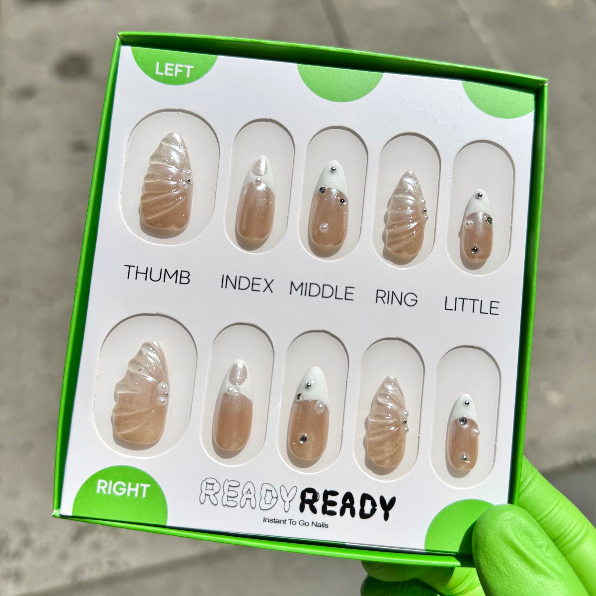 Each READY READY press-on is hand-tested for 30 days to ensure top quality. Pearl Shell showcases a nude base enhanced with white pearl chrome and a distinctive white French 3D shell design. This fusion of subtle tones and textured shell shapes delivers an elegant, refined manicure with a sophisticated sheen.