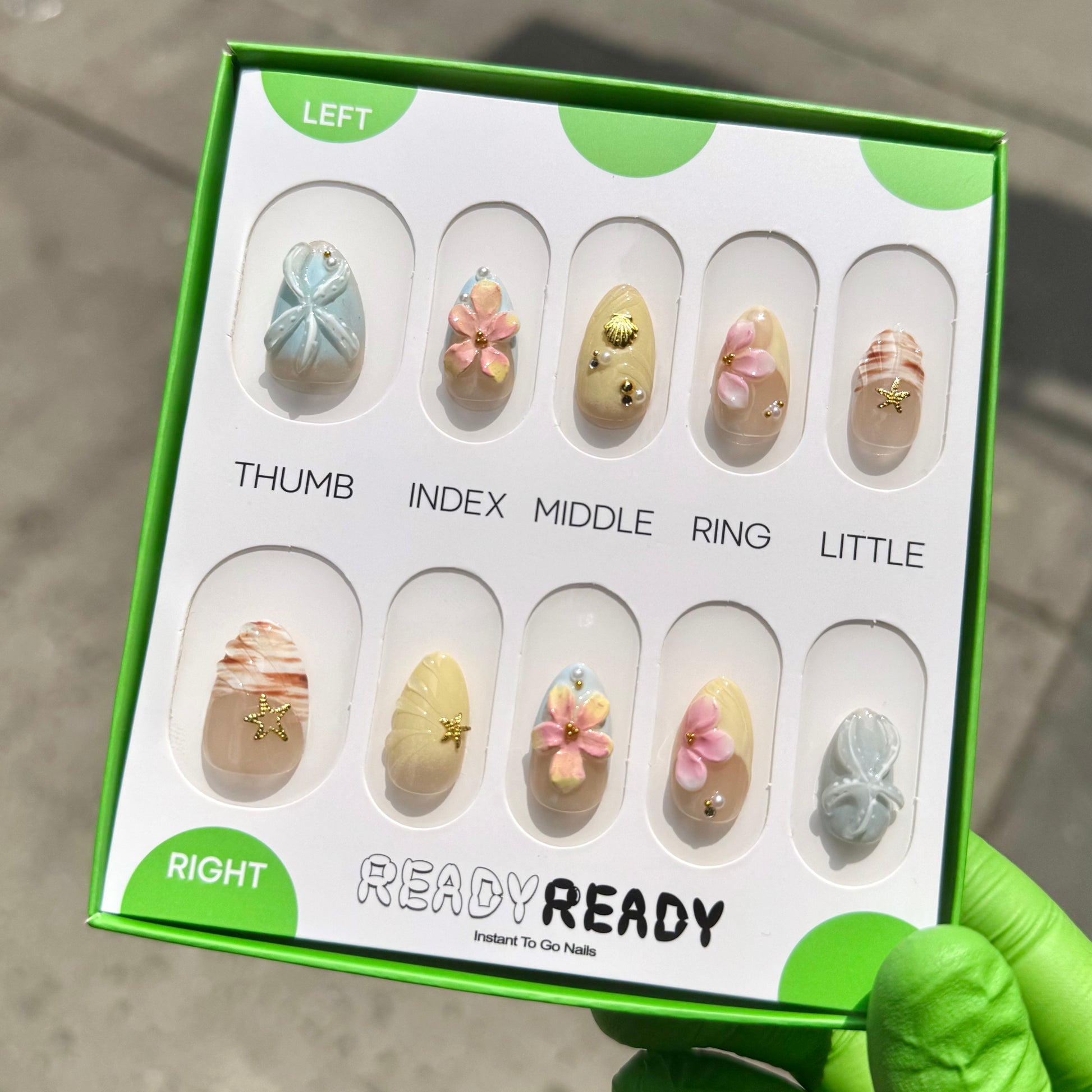 Each READY READY press-on is hand-tested for 30 days to ensure top quality. Embrace coastal elegance with Shoreline Bliss, featuring delicate 3D seashells, flowers, and starfish motifs in soothing light yellow and light blue hues.