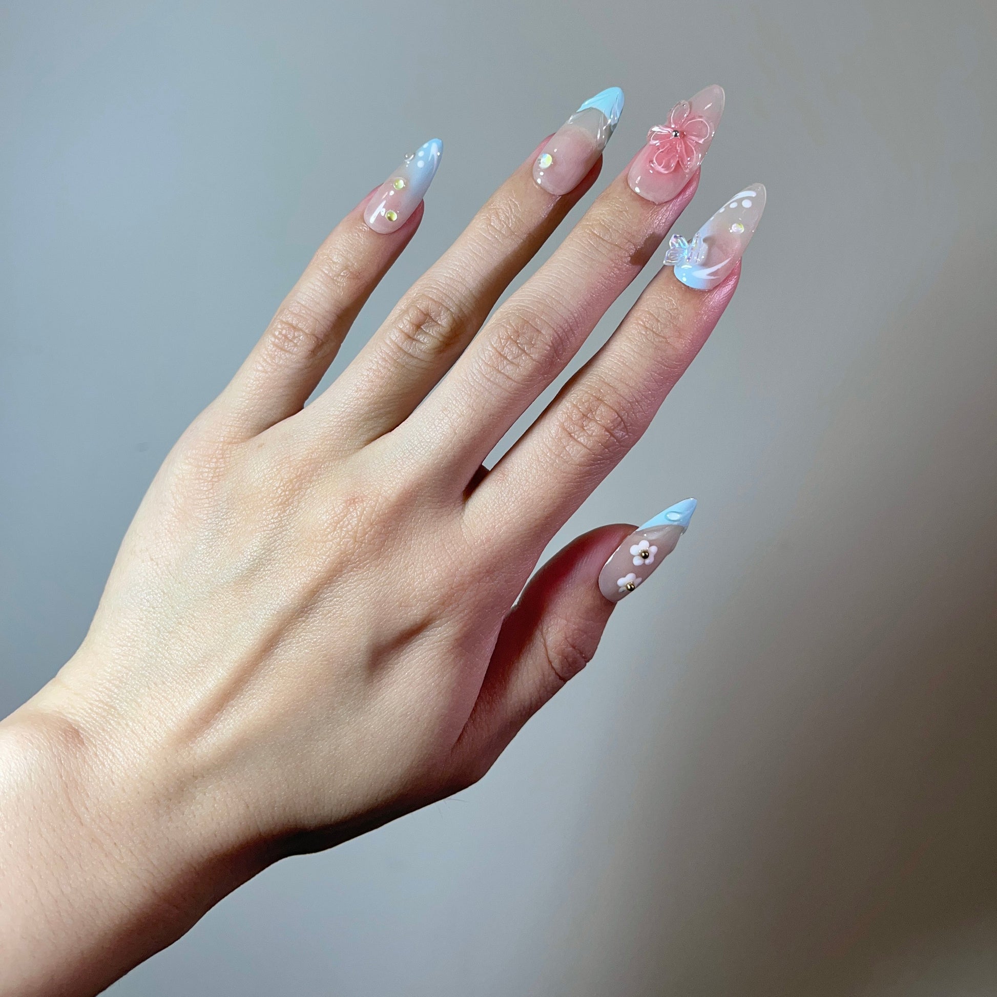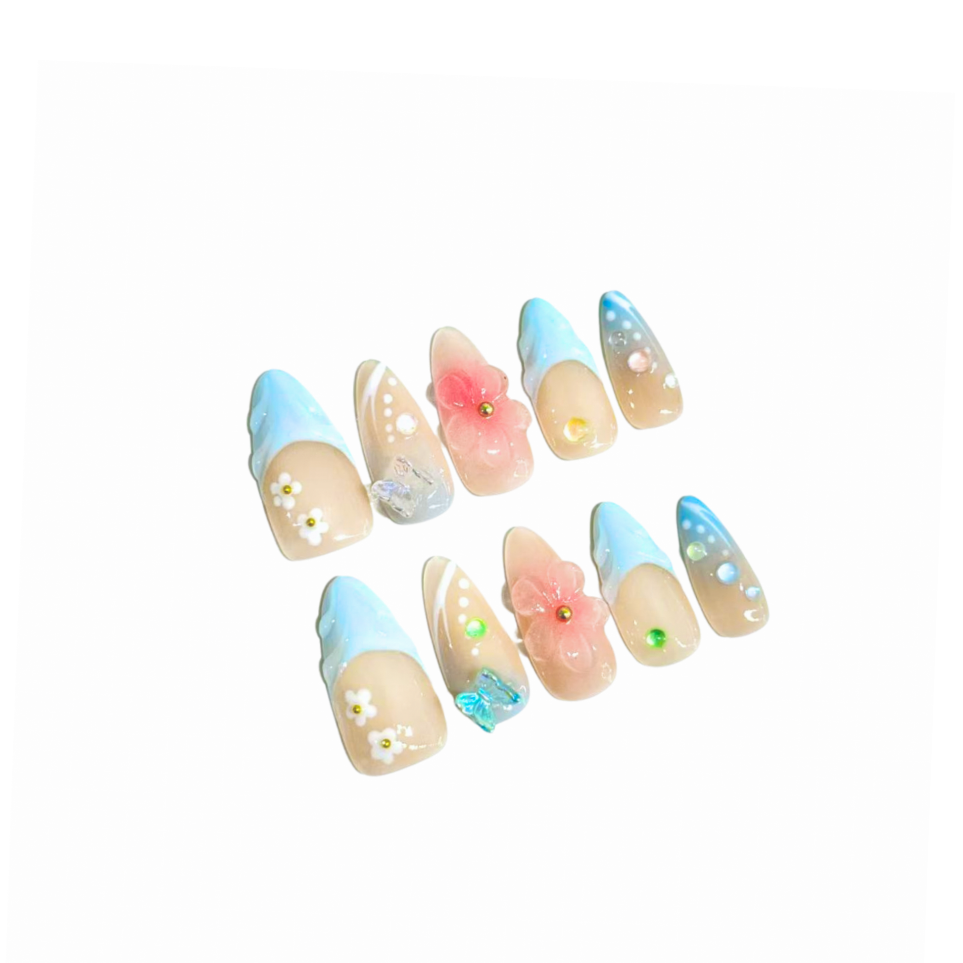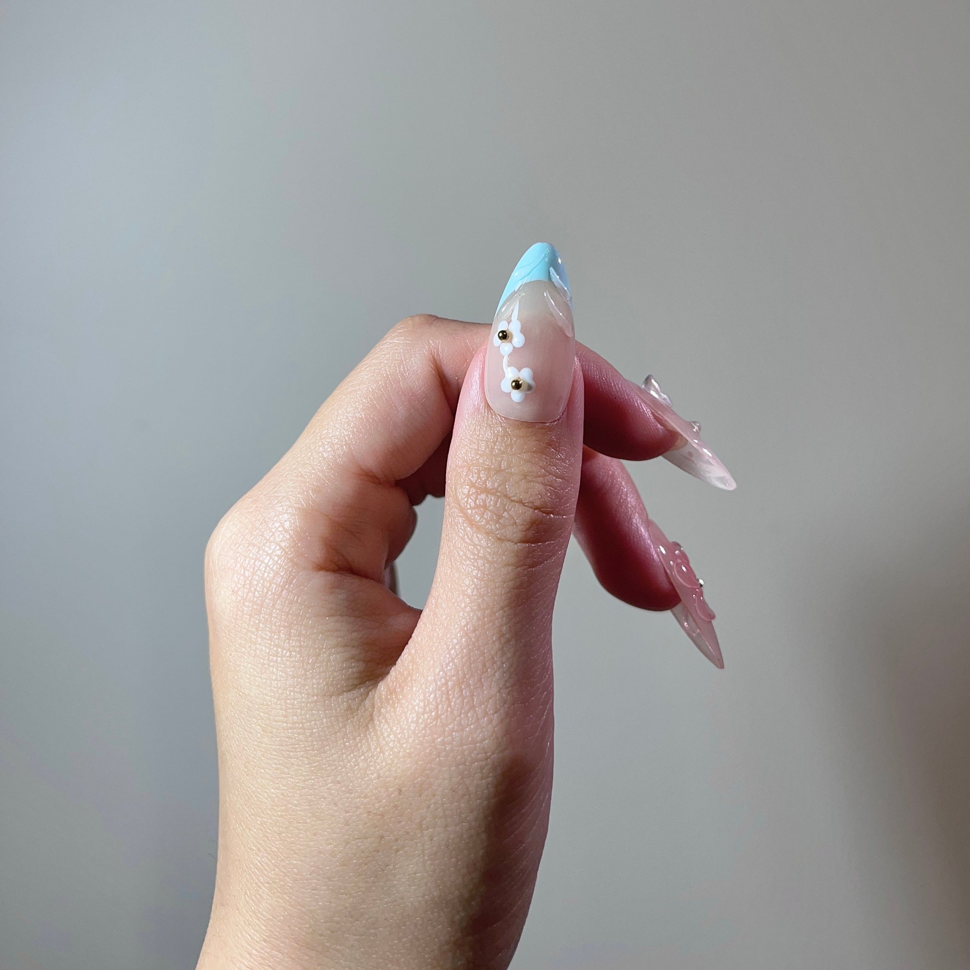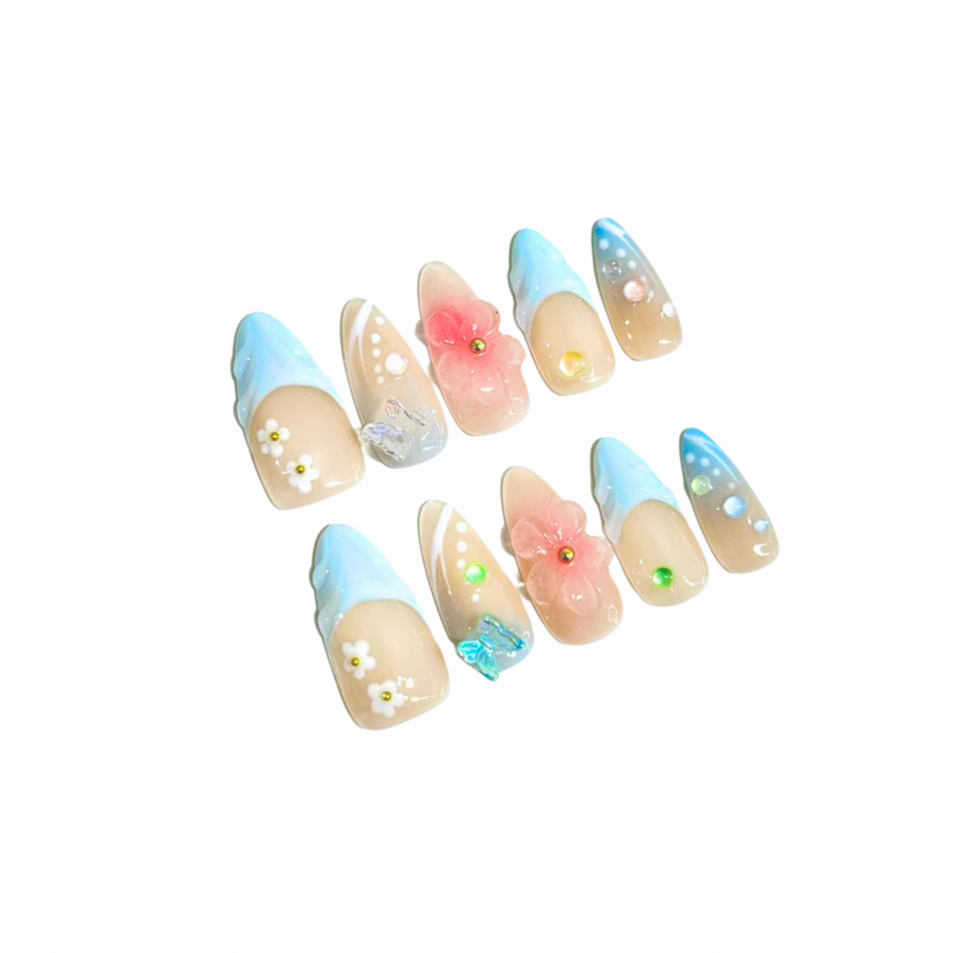 Each READY READY press-on is hand-tested for 30 days to ensure top quality. Blossom Sky captures the vibrant spirit of summer beach flowers with a delicate floral design set against soft, sky-inspired tones.