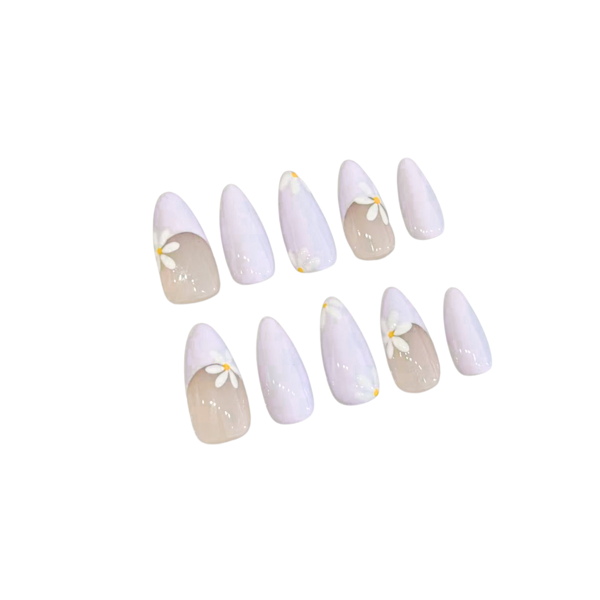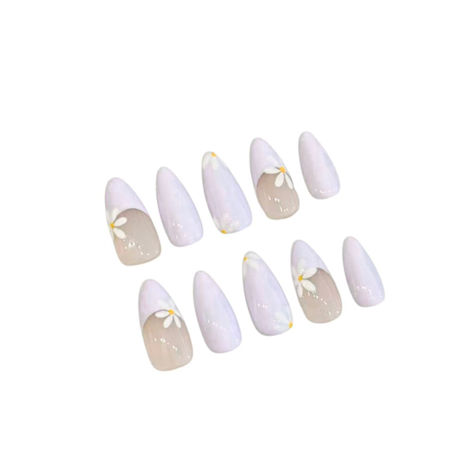 Each READY READY press-on is hand-tested for 30 days to ensure top quality. Lavender Daisy features a delicate light purple French tip complemented by intricately detailed daisy accents.