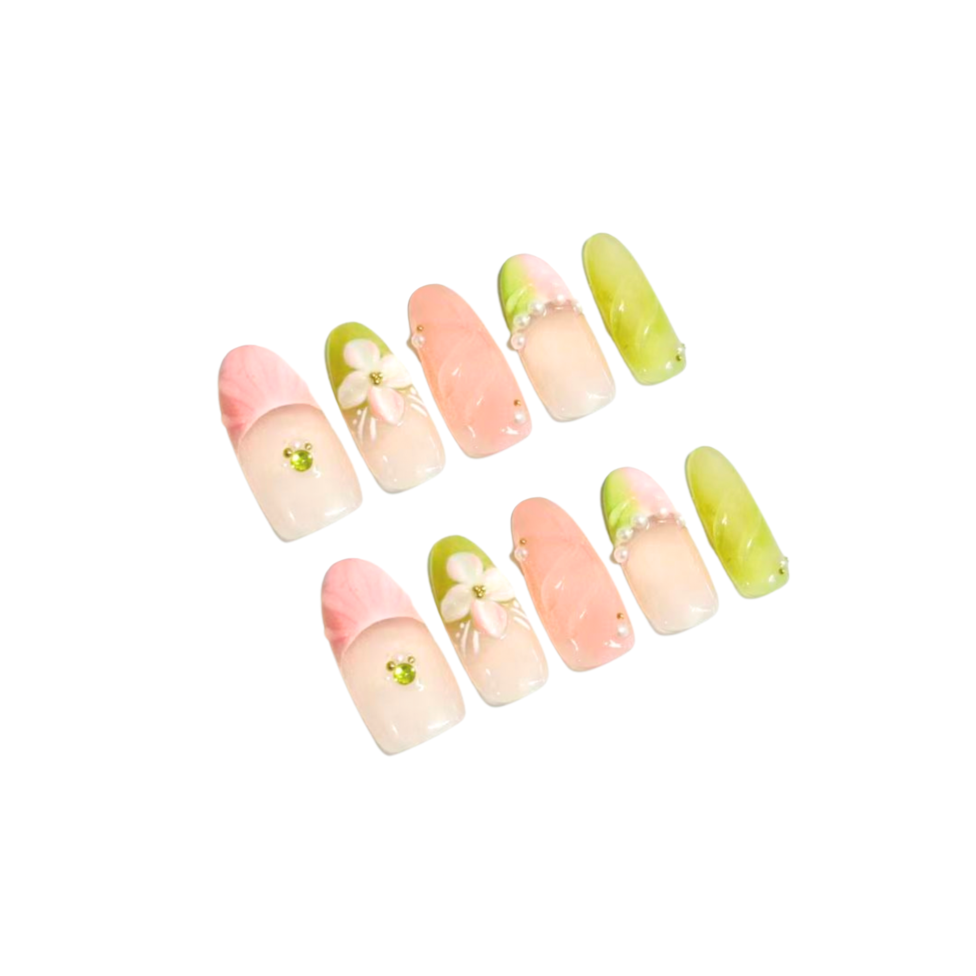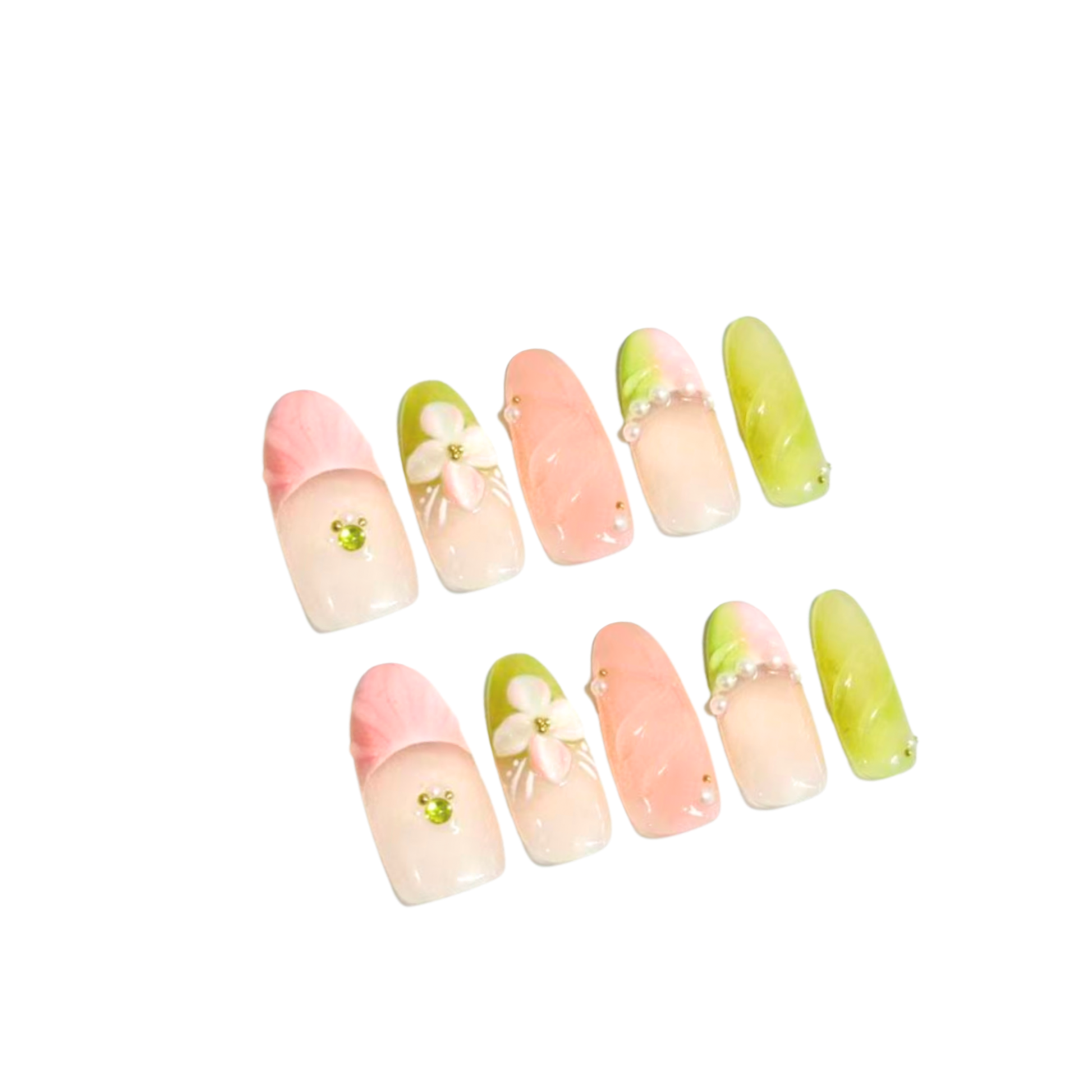 Each READY READY press-on is hand-tested for 30 days to ensure top quality. Garden Blush combines elegant pink and green French tips with detailed 3D floral accents.