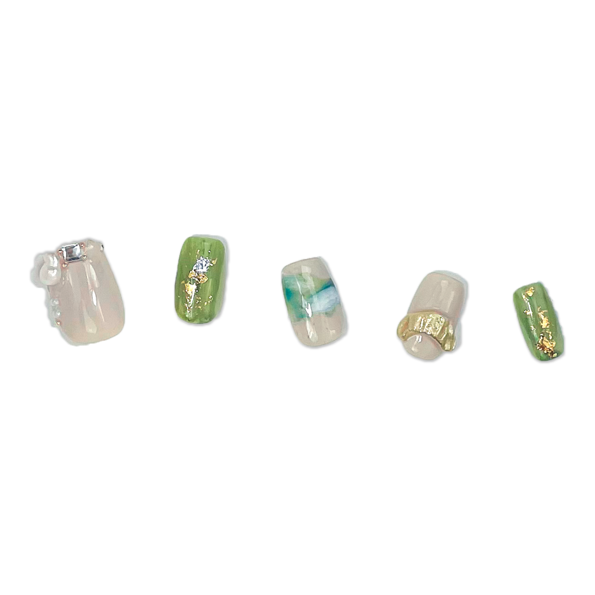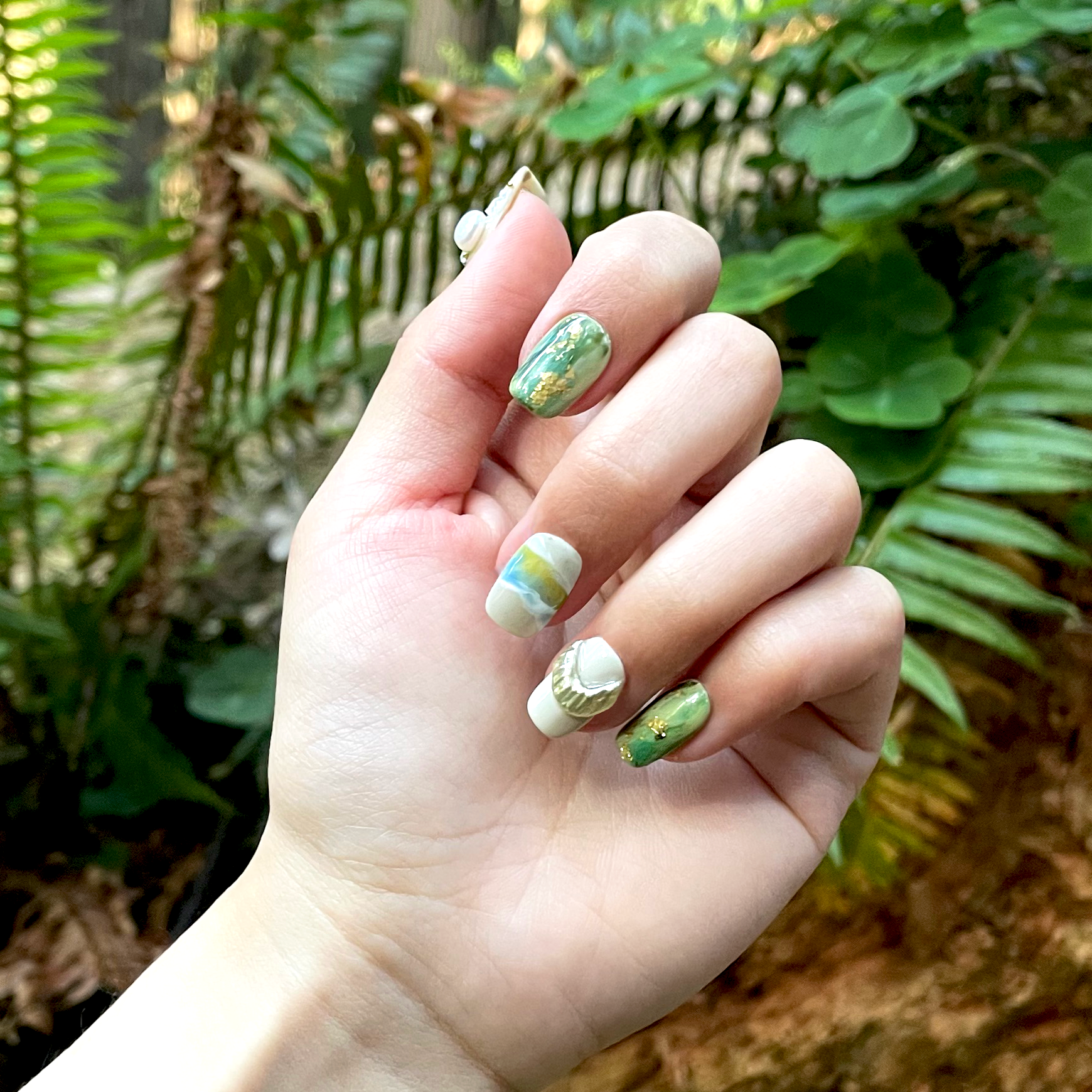 Each READY READY press-on is hand-tested for 30 days to ensure top quality. Switzerland features a sophisticated blend of milky white and fresh green bases, elegantly accented with refined gold elements.