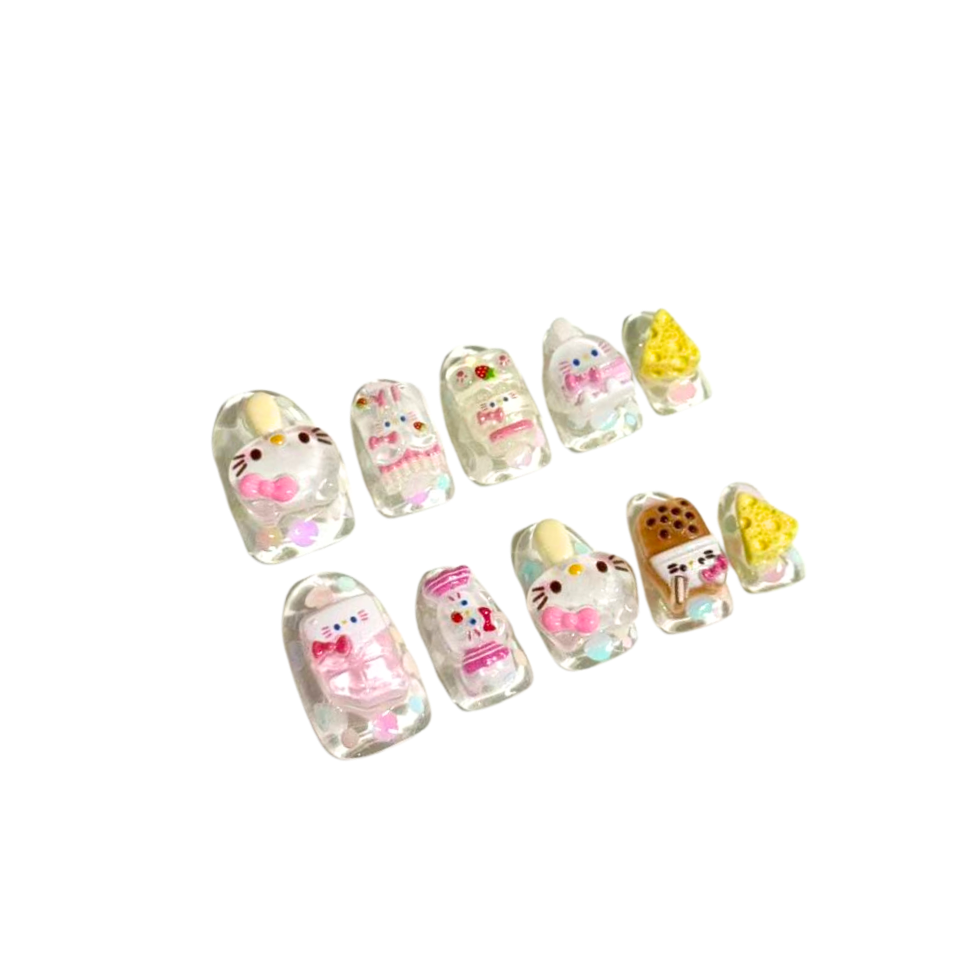 Each READY READY press-on is hand-tested for 30 days to ensure top quality. Vacation Kitty features a clear base elegantly accented with detailed 3D kitty elements.