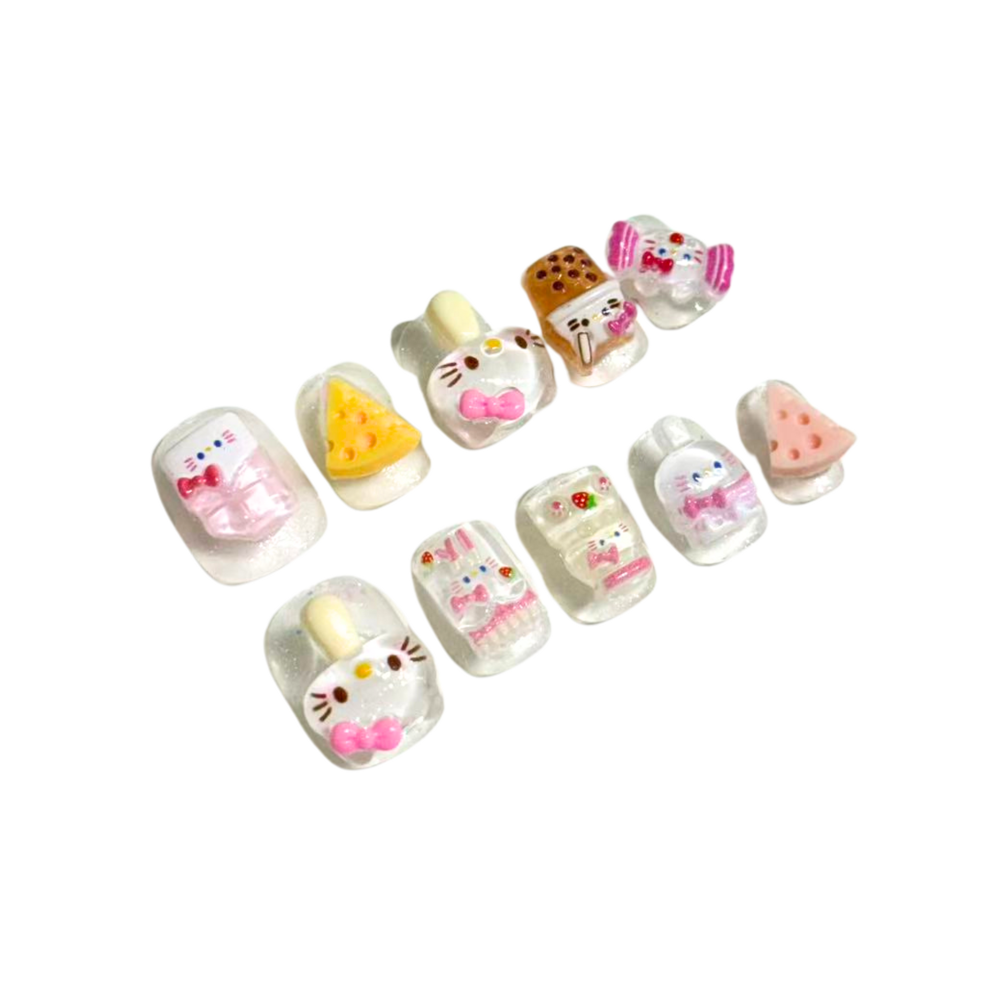 Each READY READY press-on is hand-tested for 30 days to ensure top quality. Vacation Kitty features a clear base elegantly accented with detailed 3D kitty elements.