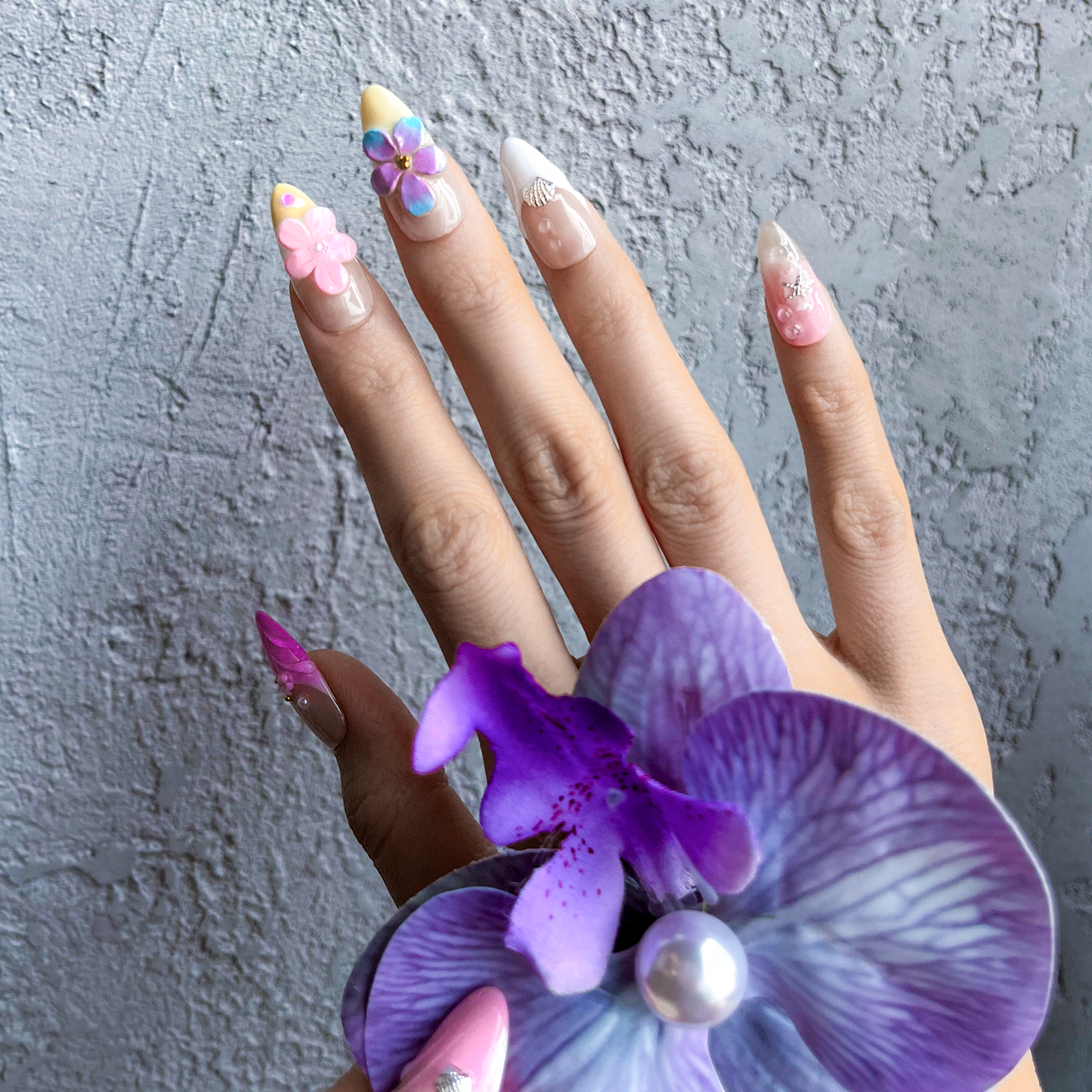Each READY READY press-on is hand-tested for 30 days to ensure top quality. These almond Japanese press-on nails feature pastel pink, purple, yellow, and blue shades with delicate 3D floral accents inspired by Alice in Wonderland. Reusable and durable, they are perfect for everyday wear, parties, or a playful, chic manicure.